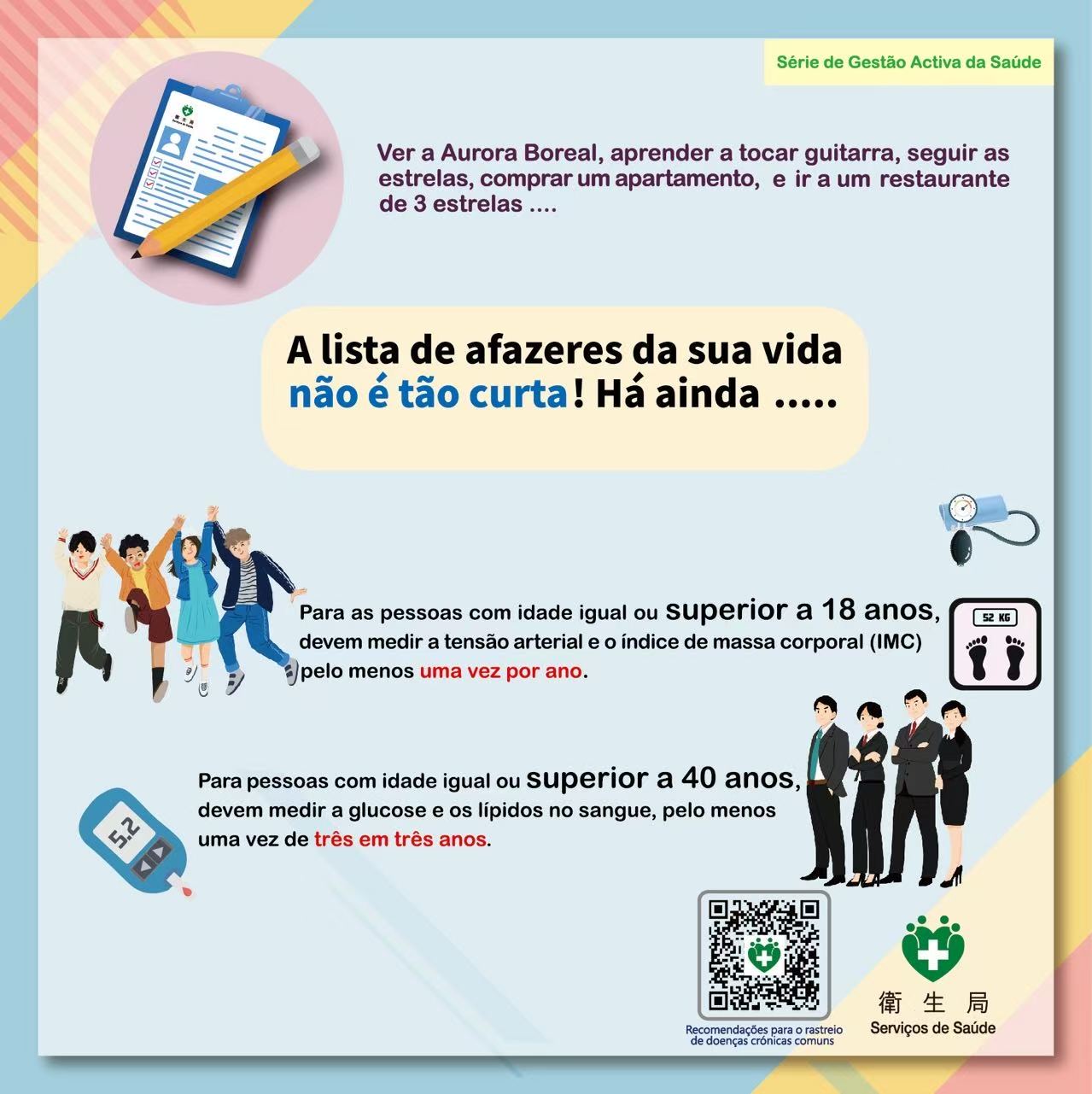 Os Serviços de Saúde prosseguem o conceito de “Tratamento eficaz em que se privilegia a prevenção”, através da elaboração de políticas de saúde, da criação de um ambiente saudável e da promoção de comportamentos saudáveis individuais, a fim de atingir o objectivo de construir uma Macau saudável. Com o objectivo de chamar a atenção da população para a questão da pressão arterial, reforçar a gestão proactiva da sua saúde, sobretudo elevar a atenção dos jovens para a medição da pressão arterial, e em articulação com o “Dia Mundial da hipertensão”, realiza-se no dia 17 de Maio a actividade “5.17 VAMOS MEDIR A TENSÃO ARTERIAL”, Os detalhes são os seguintes: