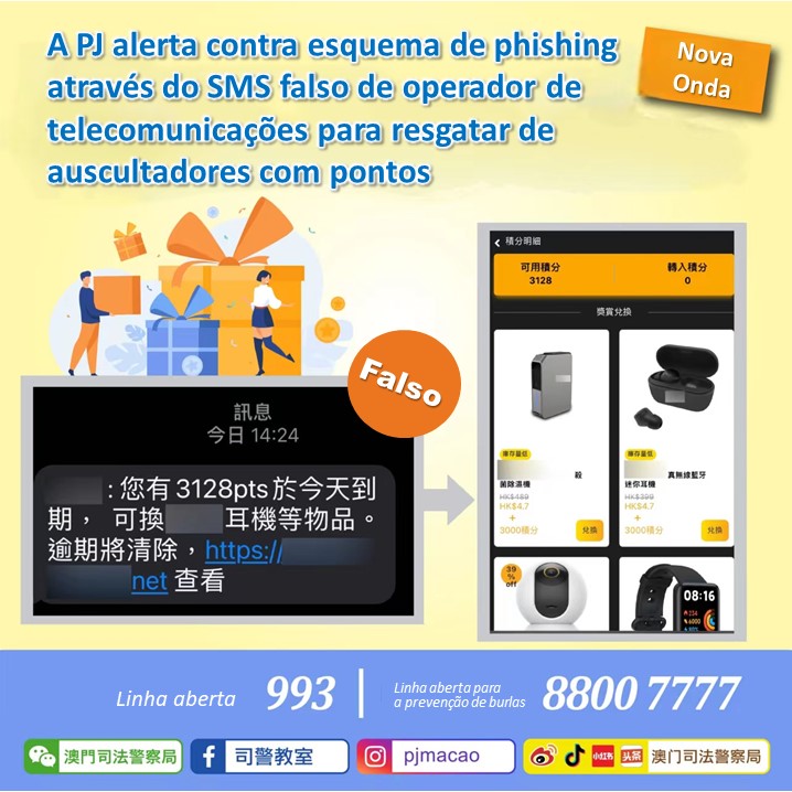 Nos últimos dias, a Polícia Judiciária recebeu mais de uma dezena de denúncias de cidadãos que alegam ter recebido SMS falsos de uma empresa de telecomunicações de Macau, pedindo-lhes que clicassem imediatamente no link indicado na mensagem de forma a resgatar uns auscultadores e outros presentes através de pontos que estavam prestes a expira. Todavia, ao fazer-se o clique nos referidos links, as pessoas eram levadas a um site falso e muito semelhante ao site oficial, onde supostamente poderiam trocar pontos por produtos a preços baixos tratando-se, portanto, de um esquema para obter informações pessoais do utilizador e do cartão de crédito das vítimas pois que, logo depois, as vítimas descobriram que seu cartão de crédito havia sido utilizado ilegalmente para uma transacção de grande valor, suspeitando assim de ser burlada. Os mais de dez cidadãos acima referidos tiveram um prejuízo de cerca de 60 mil patacas. O Centro de Coordenação de Combate à Fraude da PJ alerta os cidadãos para: