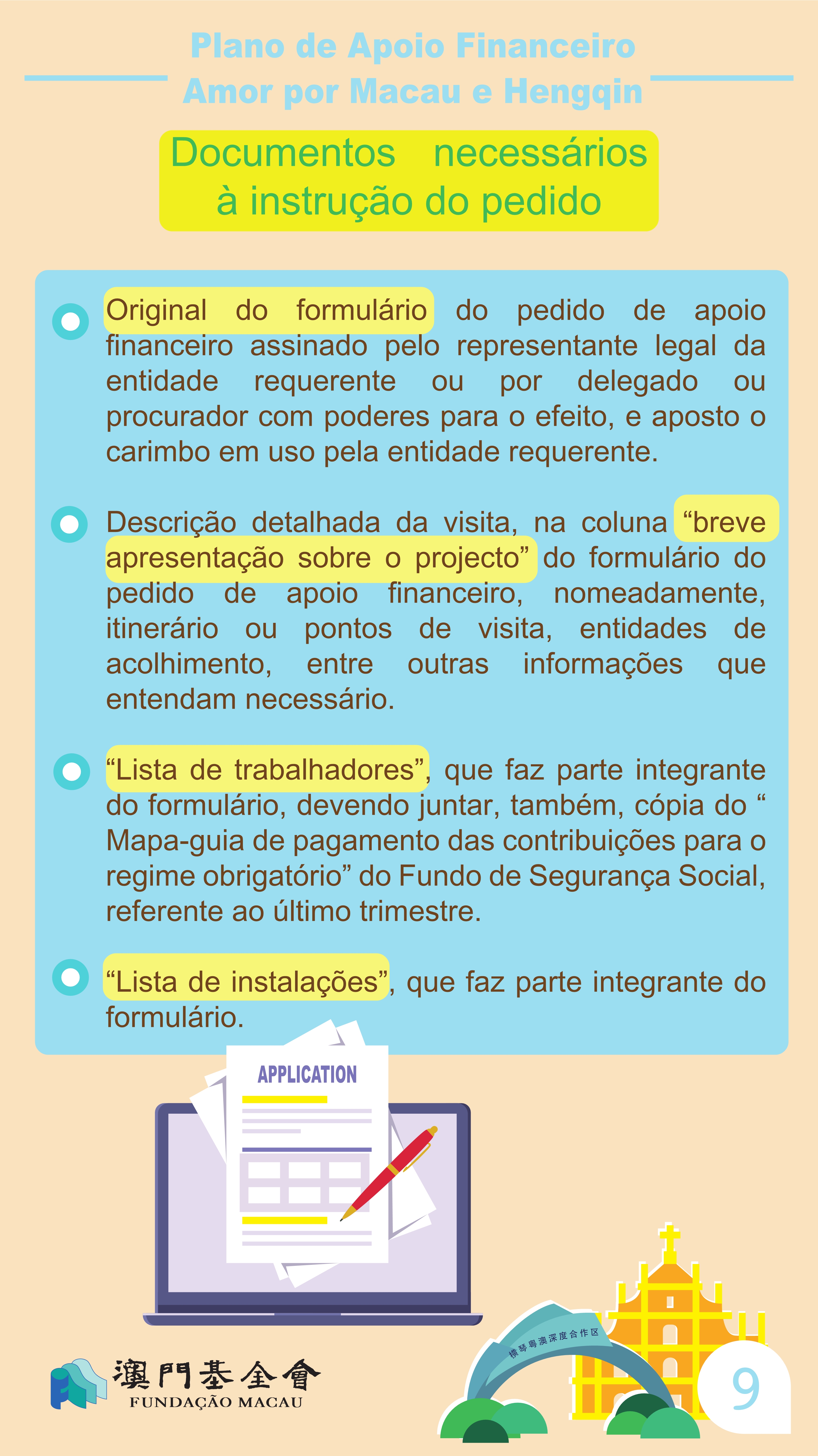 Os regulamentos, imagens, lista das agências, lista das plataformas de pagamento, roteiros e lista de restaurantes encontram-se disponivéis no website da FM : www.fmac.org.mo/sponsorship. Entre os próximos dias 20 e 31de Maio, as associações interessadas podem, submeter o pedido de apoio financeiro, através da plataforma online da FM, bem como os formulários assinados e carimbados e outros documentos necessários que depois devem ser entregues à FM. Não serão aceites pedidos submetidos fora do prazo.