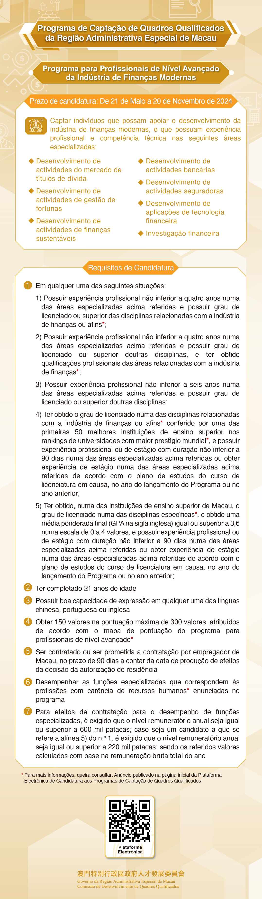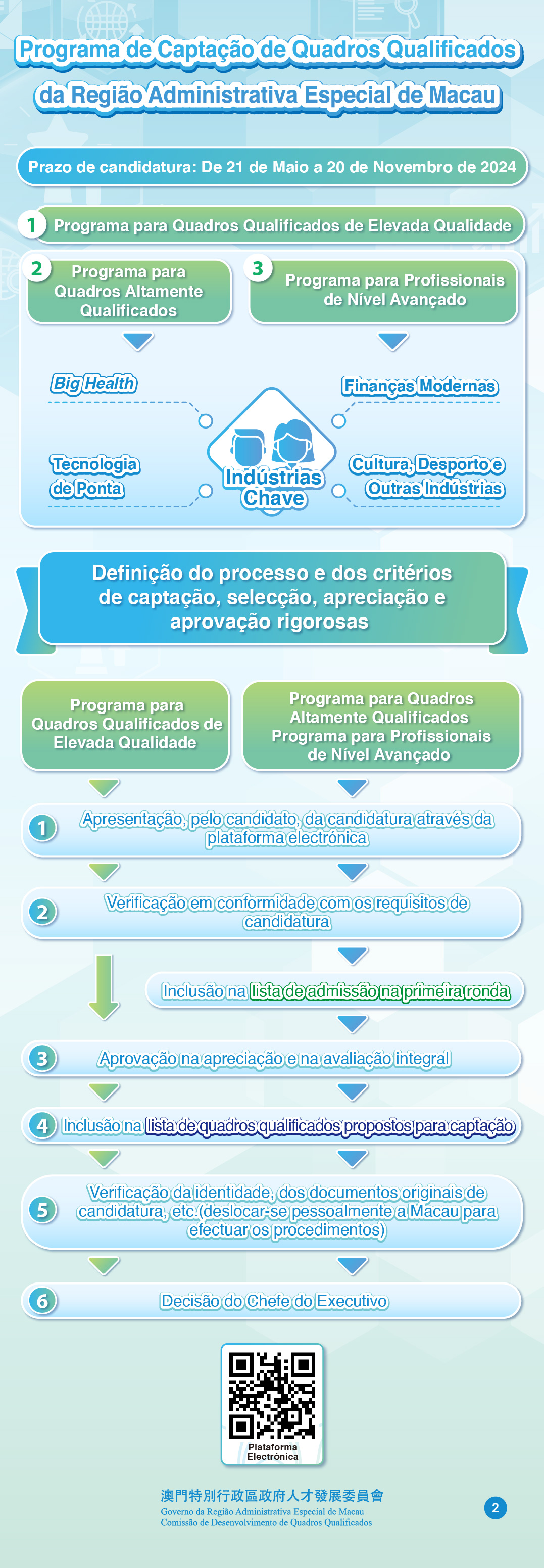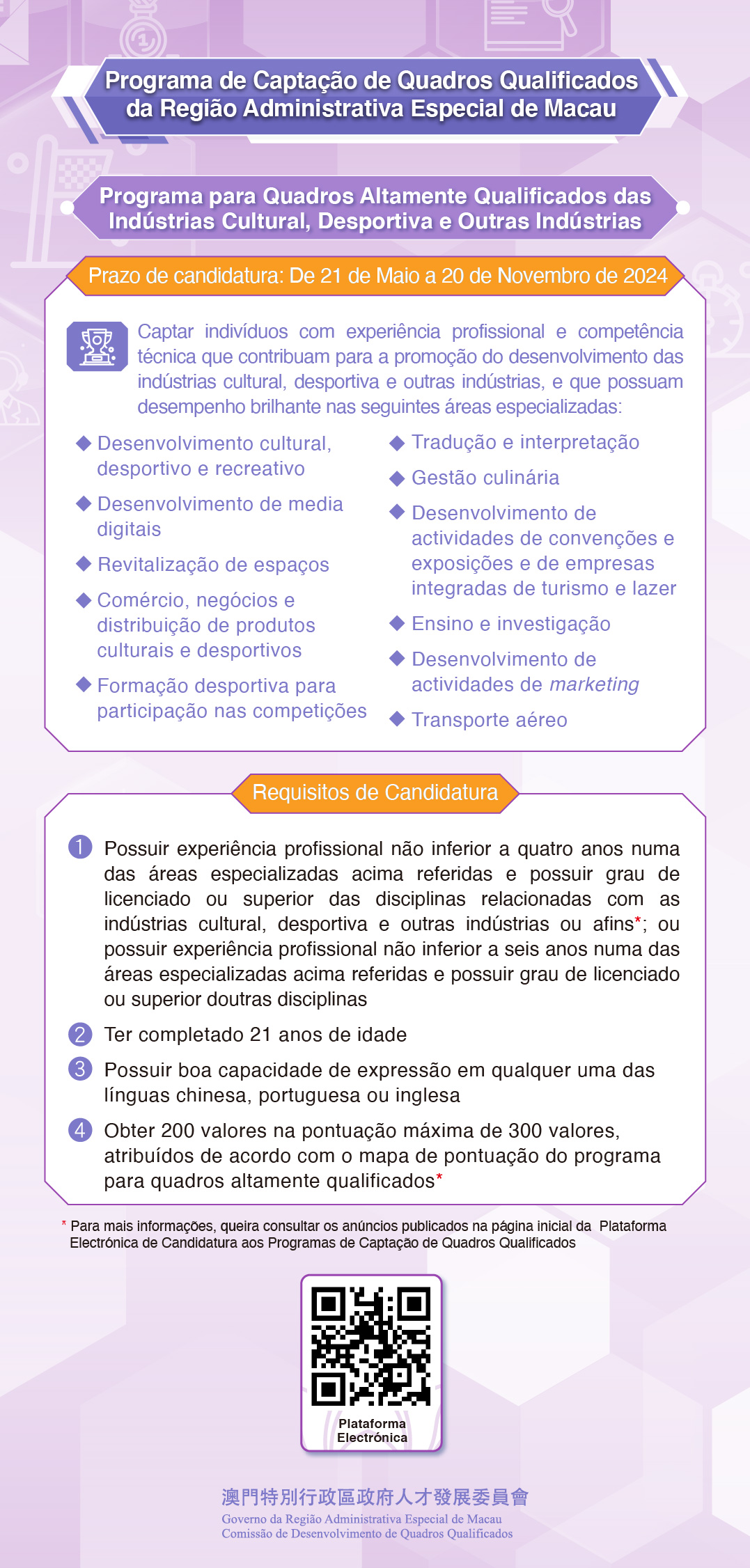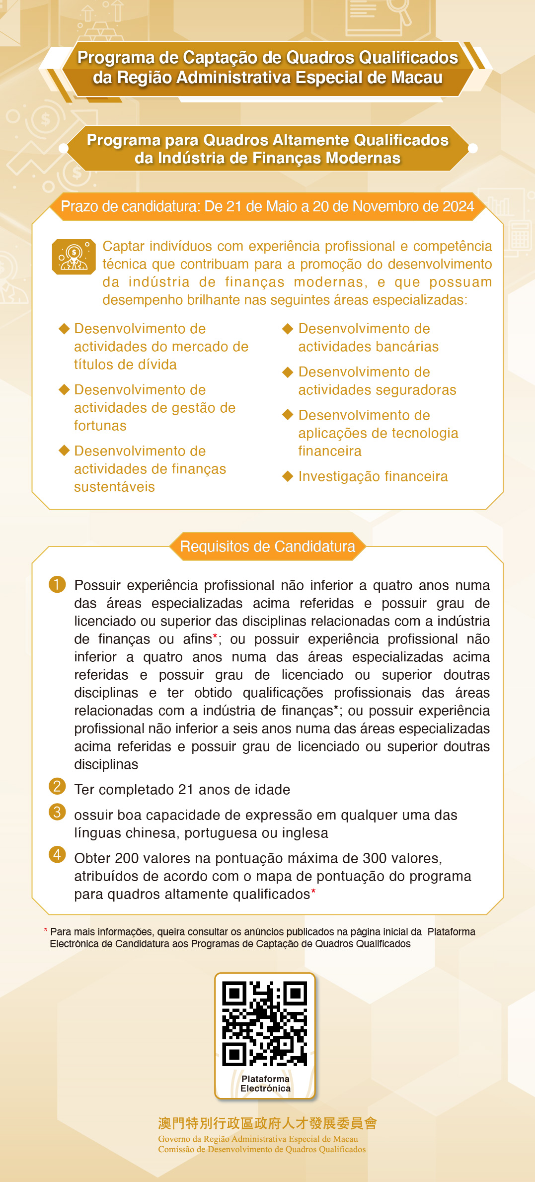 Com o intuito de promover a diversificação adequada da economia “1+4”, elevar a capacidade inovadora, a competitividade e o prestígio internacional da Região Administrativa Especial de Macau (RAEM) e acelerar o desenvolvimento das indústrias locais e o progresso a longo prazo da sociedade, o Governo da RAEM implementa uma nova fase do Programa de Captação de Quadros Qualificados e anuncia a abertura, entre 21 de Maio e 20 de Novembro de 2024, de candidaturas para um total de nove programas para três tipos de quadros qualificados, os quais compreendem um Programa para Quadros Qualificados de Elevada Qualidade, quatro Programas para Quadros Altamente Qualificados da indústria de big health, da indústria de tecnologia de ponta, da indústria de finanças modernas e das indústrias cultural, desportiva e outras indústrias, e quatro Programas para Profissionais de Nível Avançado das mesmas indústrias.