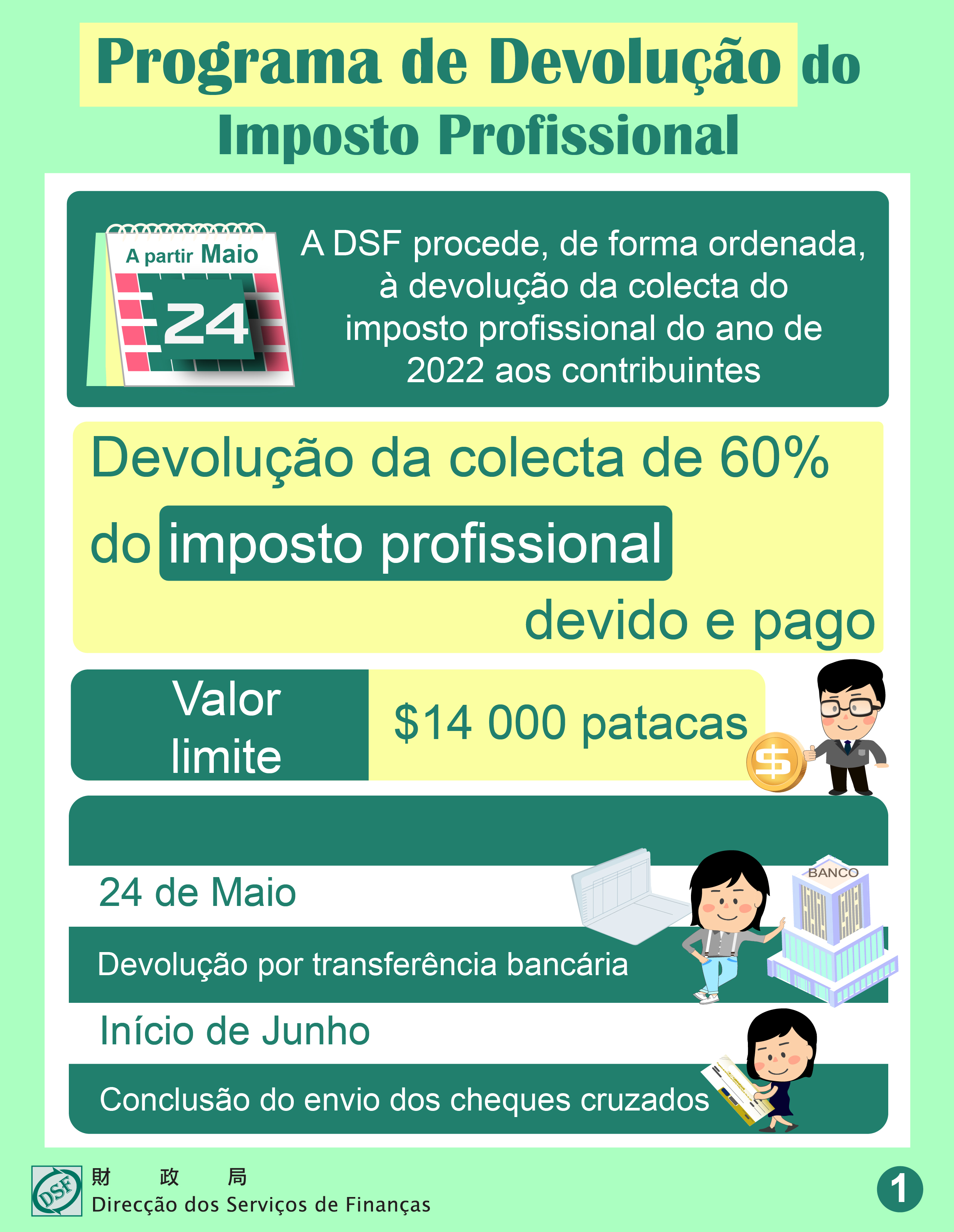 Nos termos do artigo 20.º da Lei n.º 22/2023 “Lei do Orçamento de 2024”, a partir de 24 de Maio, a Direcção dos Serviços de Finanças procede, de forma ordenada, à devolução de 60% da colecta do imposto profissional devido e pago relativamente ao ano de 2022, a cerca de 158.4 mil contribuintes do imposto profissional, titulares de bilhete de identidade residente da RAEM em 31 de Dezembro de 2022, até ao valor limite de $14 000 patacas, sendo o montante total de devolução envolvido de aproximadamente 916 milhões de patacas.