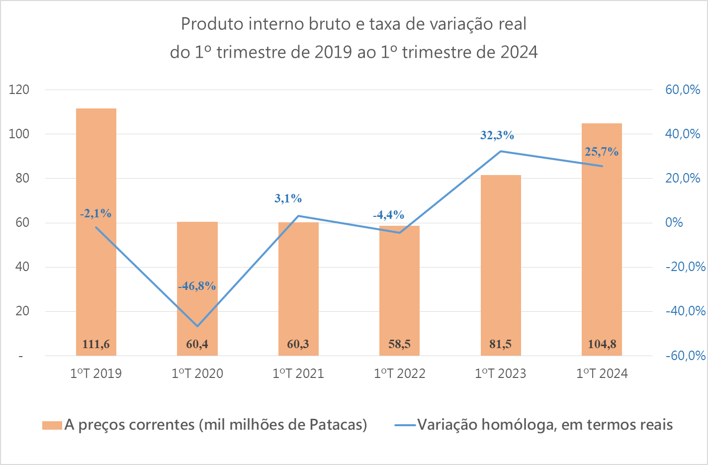 No primeiro trimestre de 2024 o Produto Interno Bruto (PIB) aumentou anualmente 25,7% em termos reais, com a recuperação a equivaler a 87,2% do volume económico do mesmo período de 2019, devido ao crescimento contínuo das exportações de serviços e à estabilização do consumo privado e da formação bruta de capital fixo, que impulsionaram a contínua recuperação económica de Macau. Salientam-se os aumentos de 62,7% nas exportações de serviços do jogo e de 14,8% nas exportações de outros serviços turísticos, bem como o acréscimo de 3,4% na procura interna (incluindo a despesa de consumo privado, a despesa de consumo final do governo e os investimentos). O deflactor implícito do PIB (106,8), que mede a variação global de preços, aumentou 2,3% em termos anuais, informam os Serviços de Estatística e Censos (DSEC).