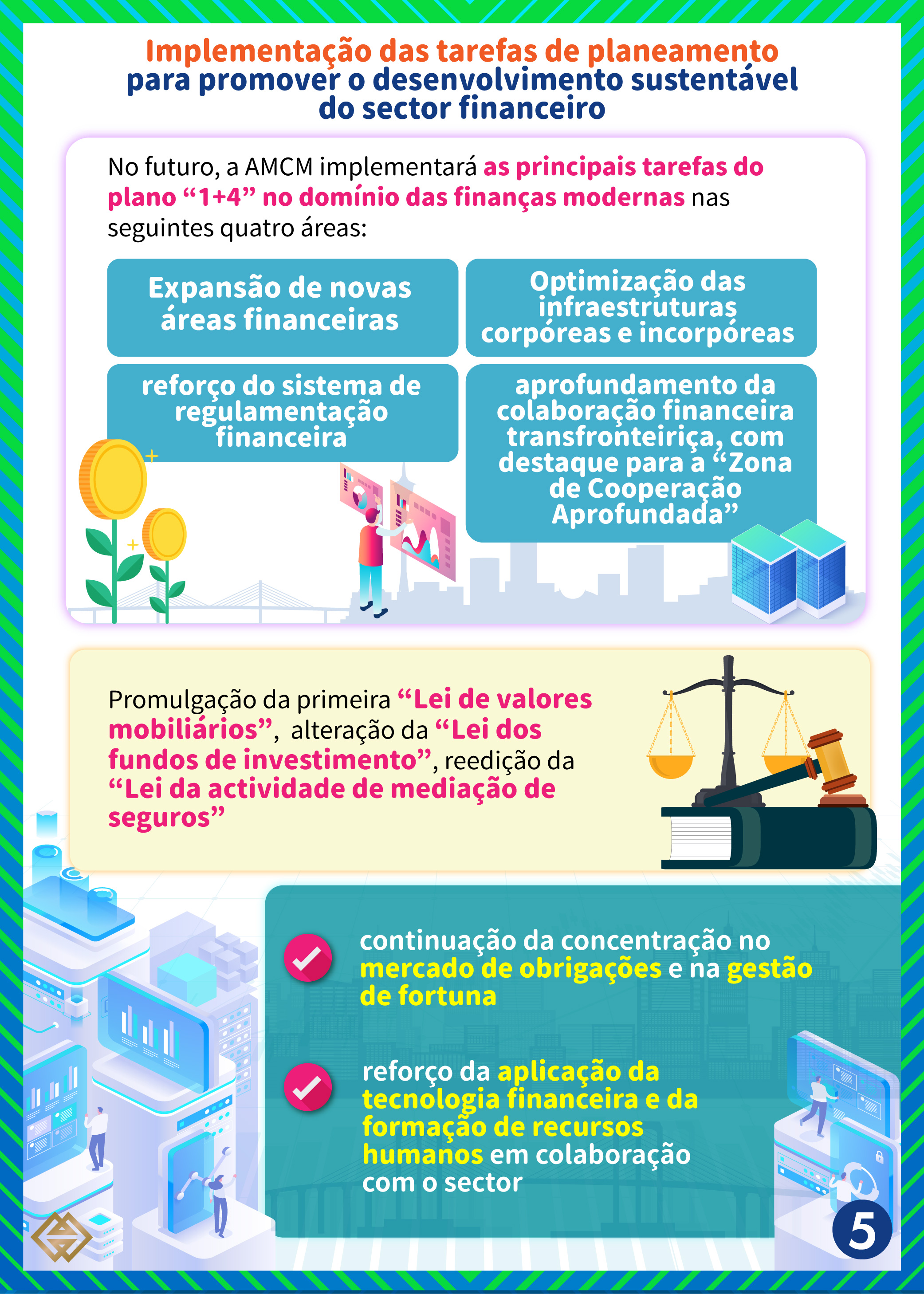 No futuro, a AMCM implementará as principais tarefas do plano “1+4” no domínio das finanças modernas nas seguintes quatro áreas: expansão de novas áreas financeiras, optimização das infraestruturas corpóreas e incorpóreas, reforço do sistema de regulamentação financeira e aprofundamento da colaboração financeira transfronteiriça, com destaque para a “Zona de Cooperação Aprofundada”. Estas áreas incluem o prosseguimento dos trabalhos para aprovação da primeira “Lei de valores mobiliários”, a alteração da “Lei dos fundos de investimento” e a revisão da “Lei da actividade de mediação de seguros”; a continuação da concentração no mercado de obrigações e na gestão de fortunas e o reforço da aplicação da tecnologia financeira e da formação de recursos humanos em colaboração com o sector.