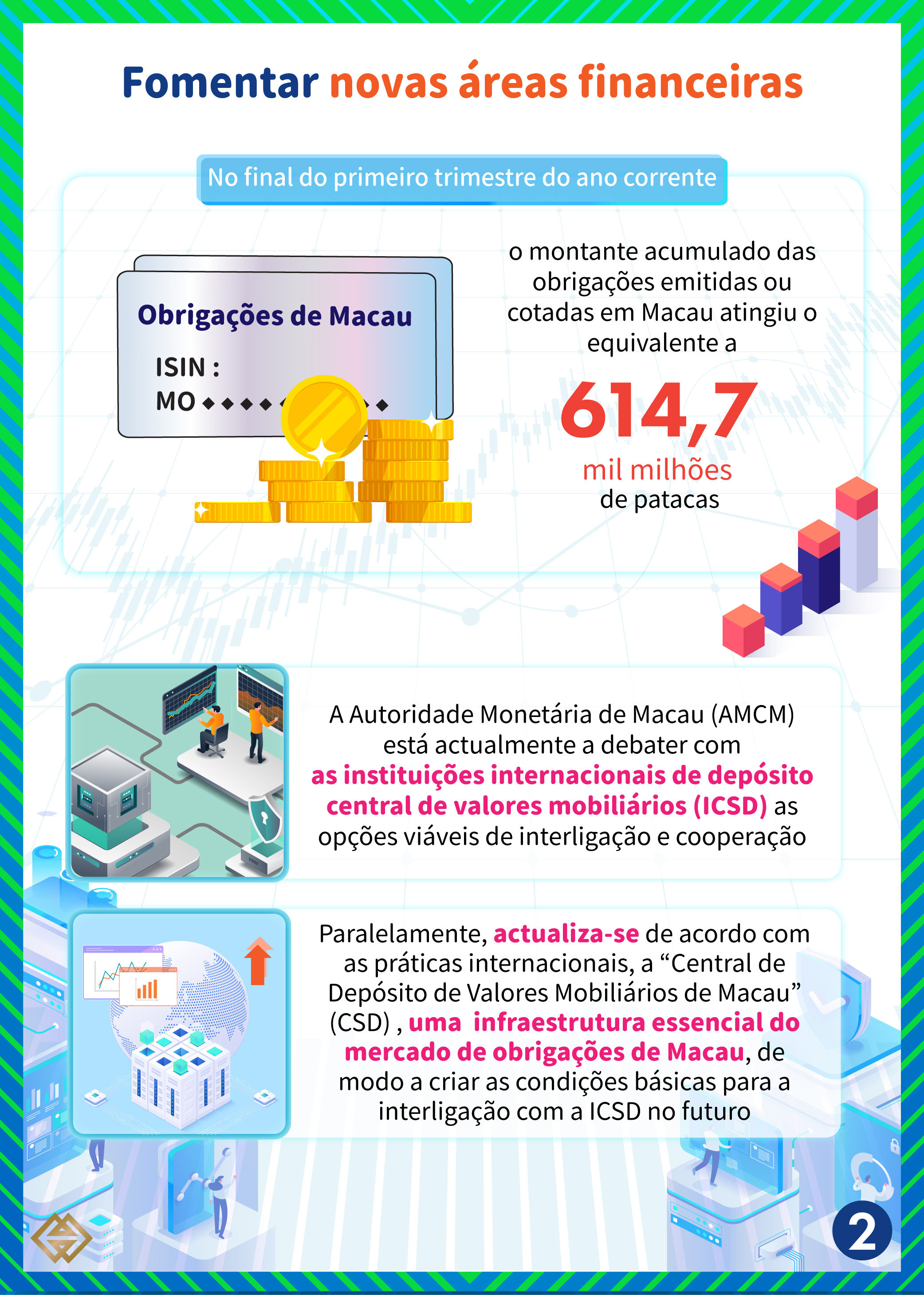 Com a conclusão gradual das infraestruturas corpóreas e incorpóreas e das condições de apoio ao mercado de obrigações de Macau, este mercado tem registado uma tendência de um desenvolvimento favorável. No final do primeiro trimestre do ano corrente, o montante acumulado das obrigações emitidas ou cotadas em Macau atingiu o equivalente a 614,7 mil milhões de patacas, abrangendo uma vasta gama de obrigações em várias moedas. A Autoridade Monetária de Macau (AMCM) está actualmente a debater com as instituições internacionais de depósito central de valores mobiliários (ICSD) as opções viáveis de interligação e cooperação; Paralelamente, está a actualizar, de acordo com as práticas internacionais, a “Central de Depósito de Valores Mobiliários de Macau” (CSD), sendo esta uma infraestrutura essencial do mercado de obrigações de Macau, com vista a criar as condições básicas para a interligação com as ICSD no futuro.