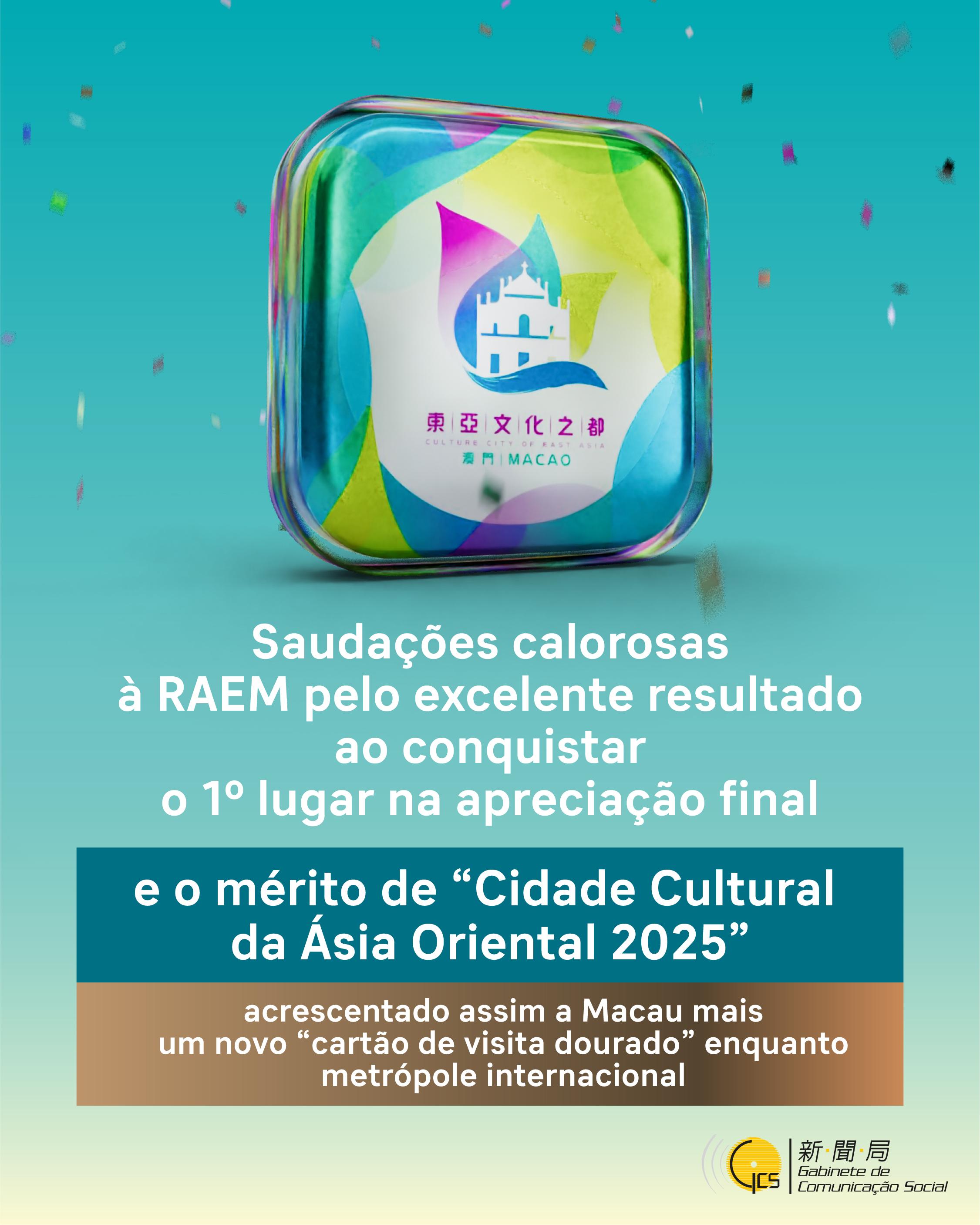 Saudações calorosas à RAEM pela conquista do mérito de “Cidade Cultural da Ásia Oriental 2025”