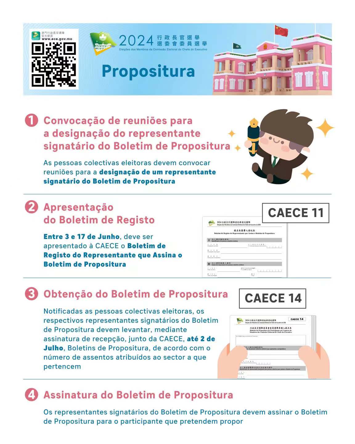 A Comissão de Assuntos Eleitorais do Chefe do Executivo (CAECE) anuncia que, a partir de amanhã (12 de Junho), serão publicados sucessivamente os dados das pessoas colectivas e dos respectivos signatários do boletim de propositura, que podem levantar o «Boletim de Propositura de Participante aos Lugares de Membros da Comissão Eleitoral do Chefe do Executivo». Ao mesmo tempo, a CAECE apela às pessoas colectivas eleitoras interessadas em exercer o direito de propositura nessas eleições, que devam aproveitar o tempo para entregar, até 17 de Junho, o «Boletim de Registo do Representante que Assina o Boletim de Propositura».