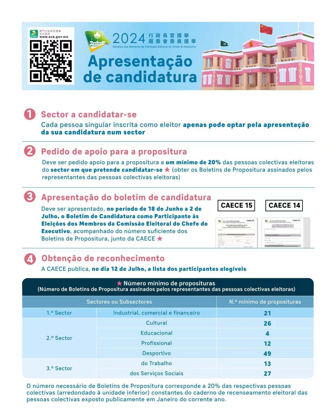 A Comissão de Assuntos Eleitorais do Chefe do Executivo (CAECE) realizou, hoje (14), uma reunião, após a qual, a presidente da CAECE, Song Man Lei, falou à comunicação social que os indivíduos interessados em participar nas eleições dos membros da Comissão Eleitoral podem apresentar a candidatura a partir da próxima terça-feira (18 de Junho). Apelou ainda às pessoas colectivas eleitoras que, para exercerem o respectivo direito de propositura, nas eleições, devem entregar o «Boletim de Registo do Representante que Assina o Boletim de Propositura» até 17 de Junho.