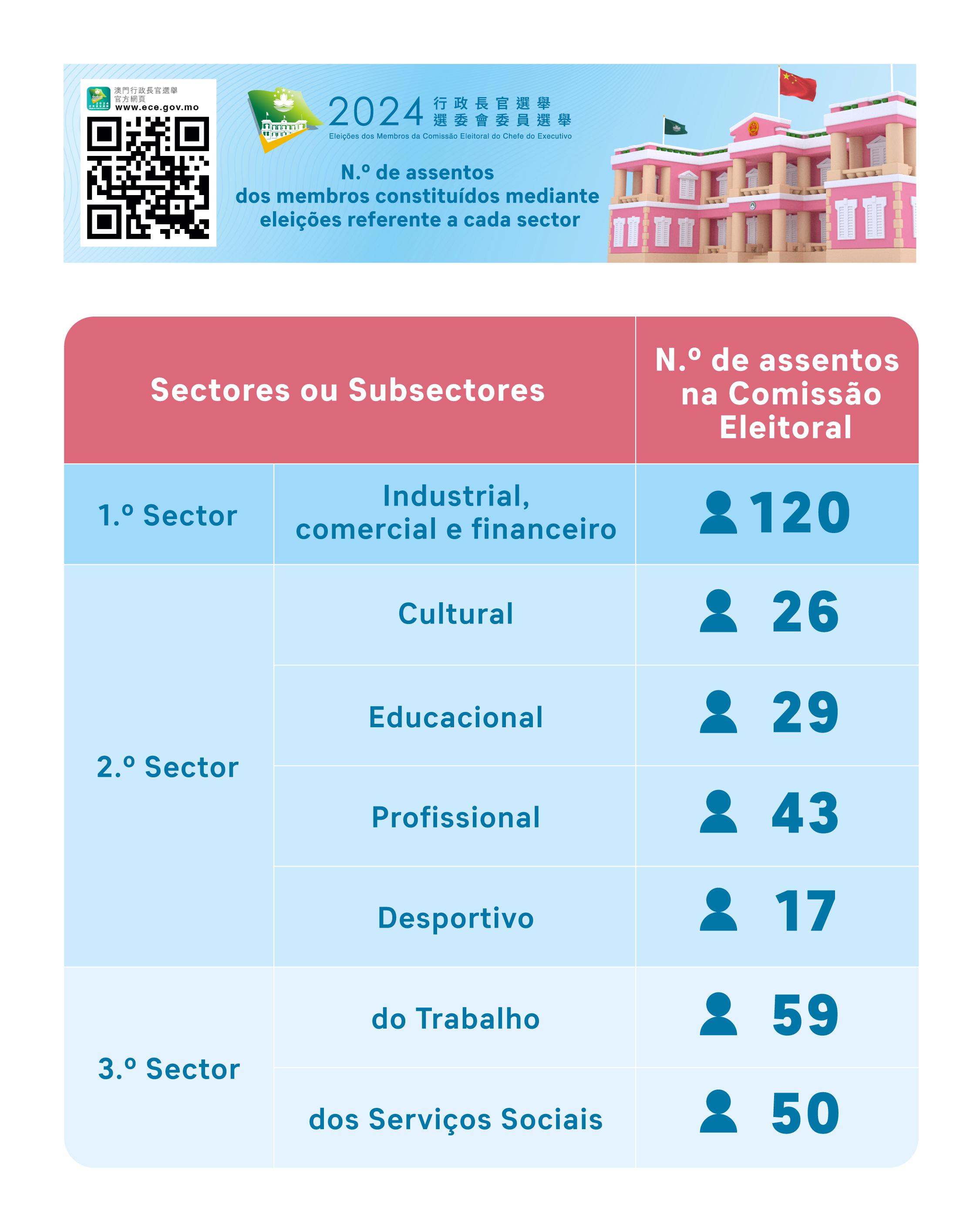 A Comissão Eleitoral do Chefe do Executivo é composta por 400 membros provenientes de quatro sectores, dos quais 344 membros do 1.° sector (industrial, comercial e financeiro), do 2.° sector (cultural, educacional, profissional e desportivo) e do 3.° sector (do trabalho e dos serviços sociais), são eleitos pelas pessoas colectivas com capacidade eleitoral activa nesse sector ou subsector, de acordo com a Lei.