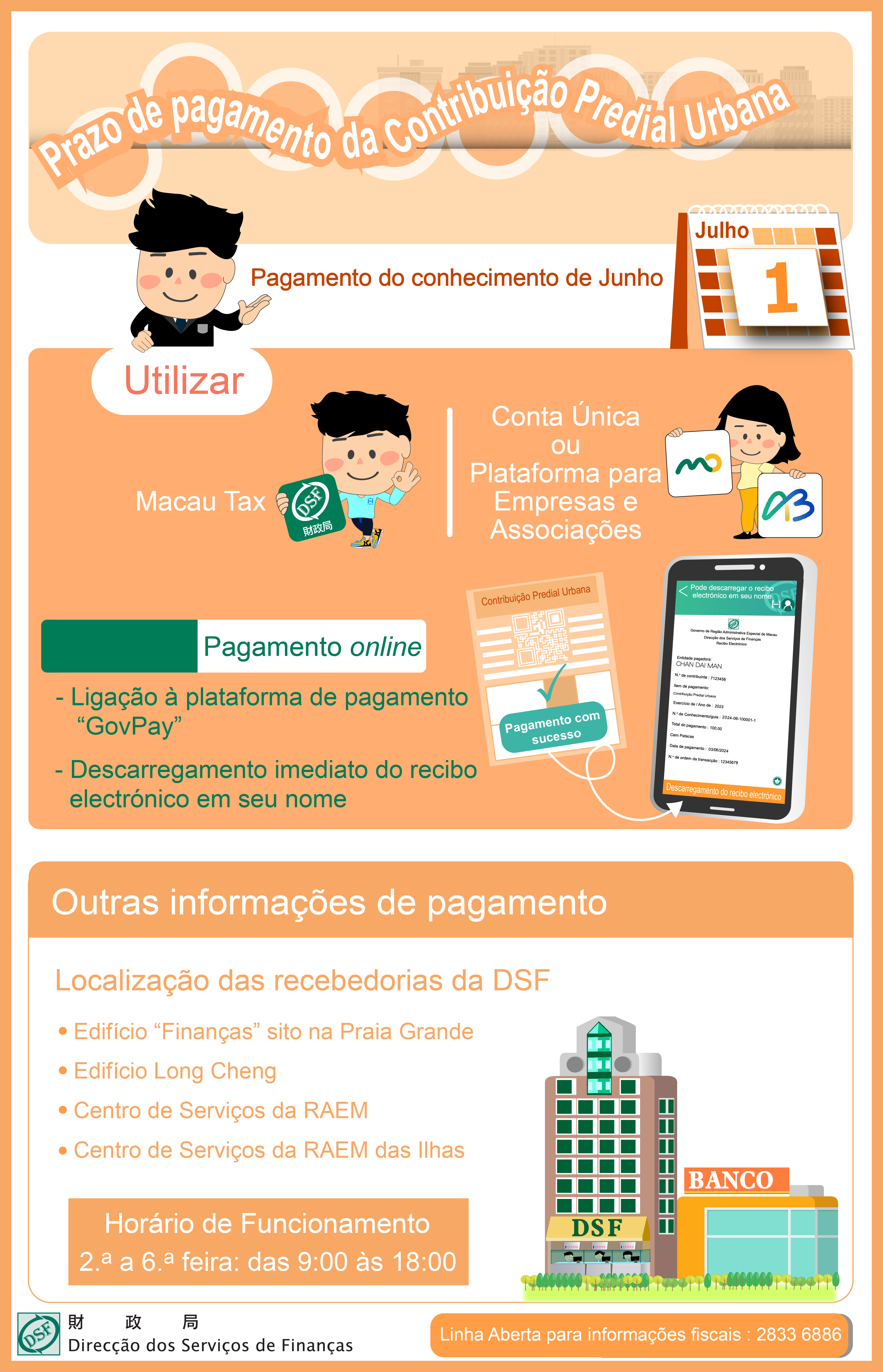 Os contribuintes podem também, durante o horário de funcionamento, efectuar o pagamento do imposto nos balcões dos bancos designados, bem como, por meio de transações electrónicas disponibilizadas pelos mesmos; ou ainda, efectuar o pagamento nas recebedorias do Edifício “Finanças” sito na Av. da Praia Grande, do Edifício Long Cheng, do Centro de Serviços da RAEM e do Centro de Serviços da RAEM das Ilhas.