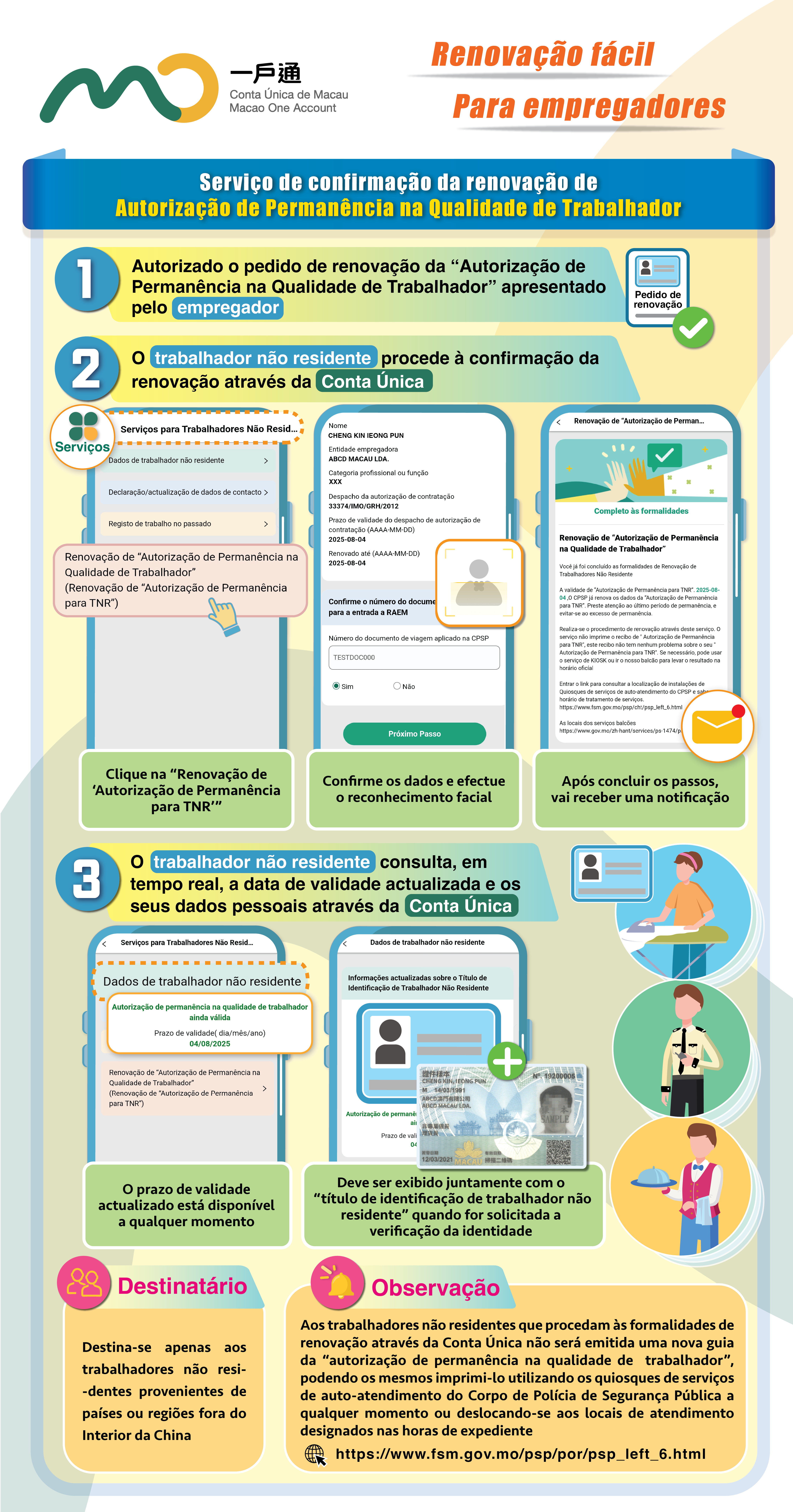 A fim de conceder mais facilidades aos empregadores no tratamento da renovação da autorização de permanência dos seus trabalhadores não residentes, a partir de 27 de Junho de 2024, o Corpo de Polícia de Segurança Pública (CPSP) irá disponibilizar, na Conta Única de Macau, um serviço para confirmar a renovação da “autorização de permanência na qualidade de trabalhador”. Após a aprovação do pedido de renovação da “autorização de permanência na qualidade de trabalhador”, submetido pelo empregador, os trabalhadores não residentes utilizadores da Conta Única poderão tratar das formalidades da confirmação da sua autorização de permanência na Conta Única (este serviço destina-se, actualmente, apenas aos trabalhadores provenientes de países ou regiões fora do Interior da China) e, logo que as tiverem concluído, poderão consultar, imediatamente, o prazo de validade da “autorização de permanência na qualidade de trabalhador”, actualizado em tempo real, na página de “Dados de trabalhador não residente” da Conta Única.