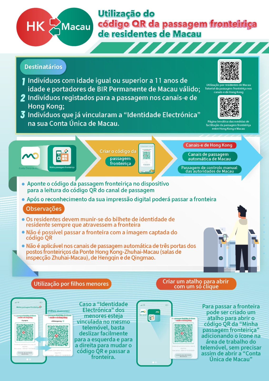 Os titulares do Bilhete de Identidade de Residente Permanente de Macau, que tenham completado 11 anos de idade, e já se registaram para a passagem no canal-e de Hong Kong e, com a identidade electrónica vinculada à Conta Única, podem abri-la para gerar este “Código da Passagem Fronteiriça”, ao entrarem ou saírem de Hong Kong através do canal-e. Caso a identificação electrónica de um menor esteja vinculada à Conta Única do seu pai/mãe ou tutor, esses só precisam de deslizar para a esquerda ou para a direita da interface do código QR da “Minha Passagem Fronteiriça”, podendo assim facilmente mudar para o outro código QR ao passarem pela fronteira.