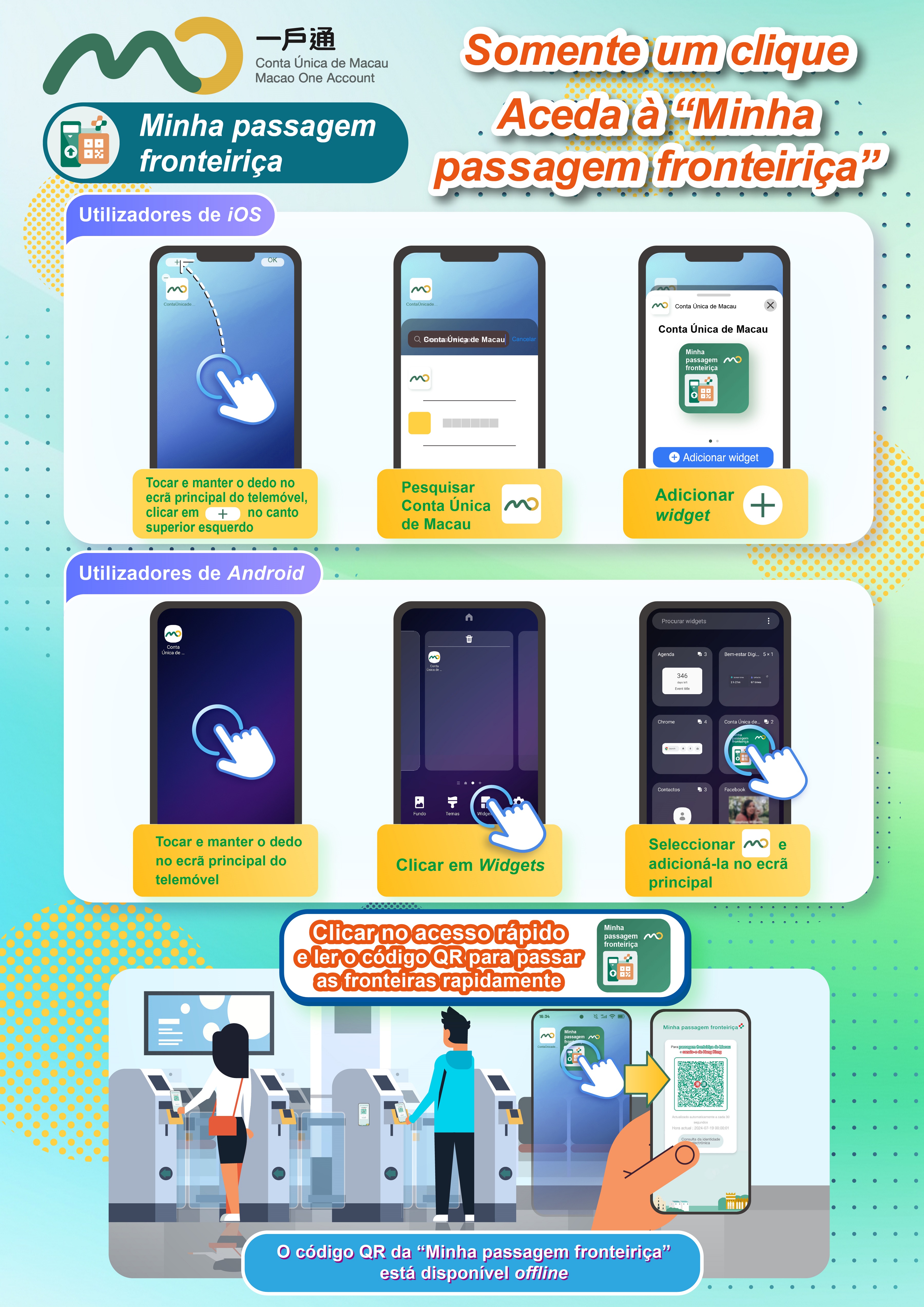 Com base nos códigos QR para atravessar a fronteira que eram utilizados por Hong Kong e Macau, os Governos dos dois territórios lançaram a nova medida para facilitar a passagem fronteiriça, em conformidade com o princípio de igualdade e de benefício mútuo. Os residentes de Hong Kong e Macau que já se registaram para utilizarem os canais de passagem automática para entrarem nestas duas Regiões, podem agora também atravessar a fronteira com o “Código para Passagens Fronteiriças entre Hong Kong e Macau” mediante estes canais de passagem automática, não necessitando de exibir o seu bilhete de identidade físico.