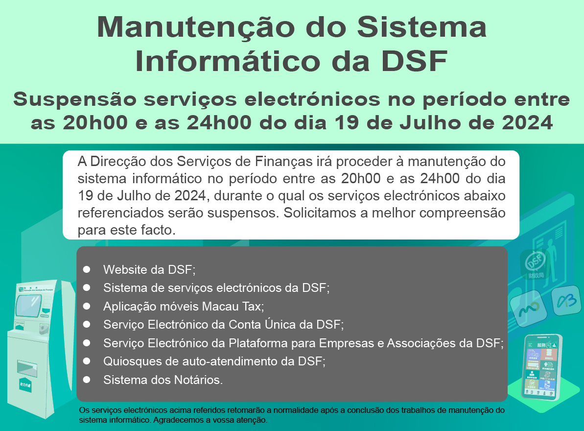 A Direcção dos Serviços de Finanças irá proceder à manutenção do sistema informático no período entre as 20h00 e as 24h00 do dia 19 de Julho de 2024, durante o qual os serviços electrónicos abaixo referenciados serão suspensos. Solicitamos a melhor compreensão para este facto.