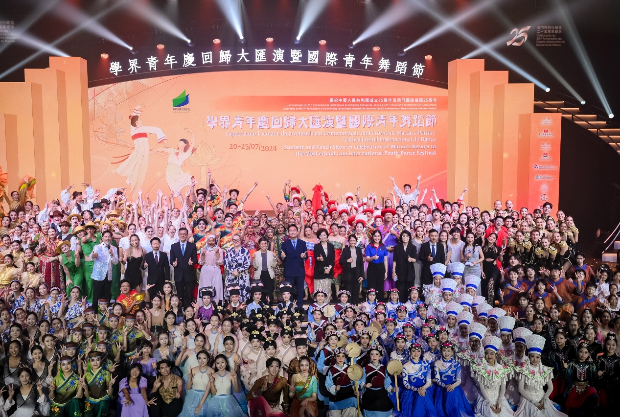 O “Espectáculo Escolar e da Juventude em Comemoração do Retorno de Macau à Pátria e Festival Juvenil Internacional de Dança” foi realizado, com sucesso, de 20 a 25 de Julho de 2024, com uma variedade de espectáculos, que incluíram desfile, flash mob, workshops de actuação artística, espectáculos ao ar livre e em recinto coberto, que atraiu um total de mais de 20 mil espectadores aos locais de realização e ainda mais de 100 mil pessoas que assistiram à transmissão ao vivo através da internet. Este evento congregou as forças de todos os sectores da sociedade, e contou com a participação de alunos e docentes do sector escolar de Macau, jovens da Grande Baía, 12 grupos de dança não locais, provenientes da Grécia, da Hungria, de Portugal, da Austrália, da Índia, da Malásia, da Tailândia, do Interior da China e de Hong Kong e, ainda, 23 grupos de Macau, num total de cerca de 1.500 artistas. Além disso, o evento proporcionou, especialmente, uma experiência cultural aos participantes, permitindo-lhes, para além da participação nas actuações de dança, sentirem, ao mesmo tempo, o encanto de Macau enquanto “cidade de gastronomia” e “cidade cultural”. Através da realização de um concurso fotográfico e de outras actividades promocionais, cidadãos e turistas puderam juntar-se em Macau, através de diferentes meios, para celebrarem, em conjunto, o 75.º Aniversário da Implantação da República Popular da China e o 25.º Aniversário do Retorno de Macau à Pátria.