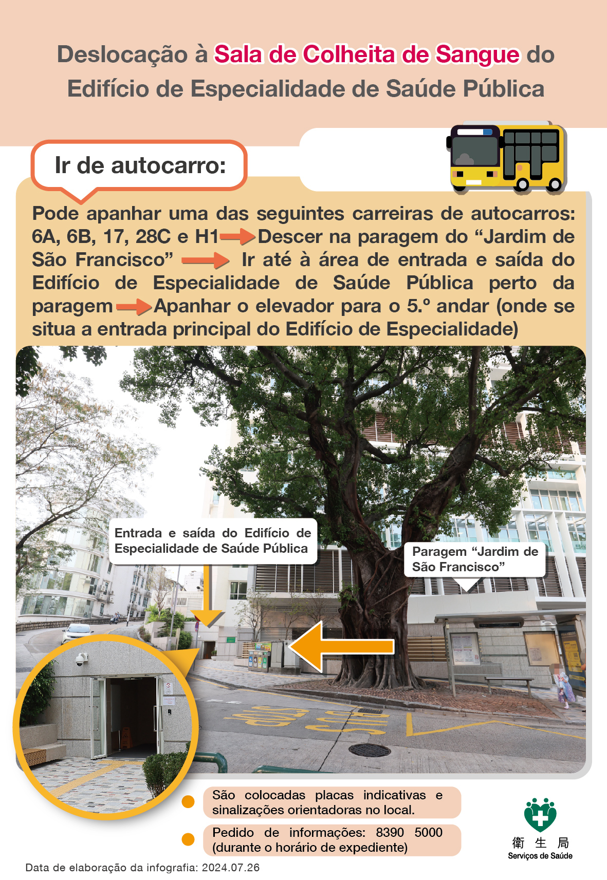 Pode apanhar um dos seguintes autocarros: 6A, 6B, 17, 28C e H1, descer na paragem de autocarro do “Jardim de São Francisco”, apanhar o elevador situado na área de entrada e saída do Edifício de Especialidade de Saúde Pública, perto da paragem, e dirigir-se à nova Sala de Colheita de Sangue no 5.º andar (onde se situa a entrada principal do Edifício de Especialidade).