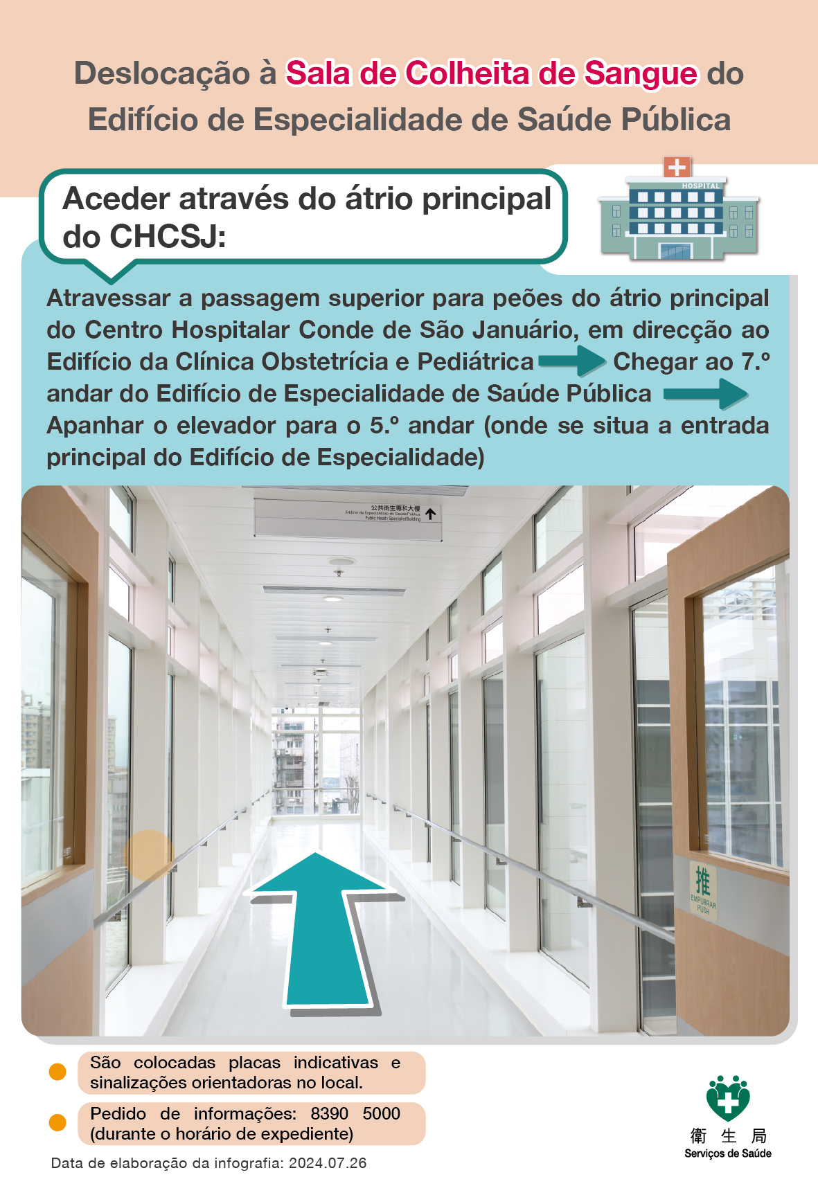 A passagem superior para peões que liga o CHCSJ ao Edifício de Especialidade de Saúde Pública encontra-se em funcionamento. Os residentes podem atravessar a passagem superior para peões do átrio principal do Centro Hospitalar Conde de São Januário, em direcção ao Edifício da Clínica Obstetrícia e Pediátrica, depois ir até ao 7º andar do Edifício de Especialidade de Saúde Pública, e depois apanhar elevador para dirigir-se à nova Sala de Colheita de Sangue situada no 5.º andar (onde se situa a entrada principal do Edifício de Especialidade).