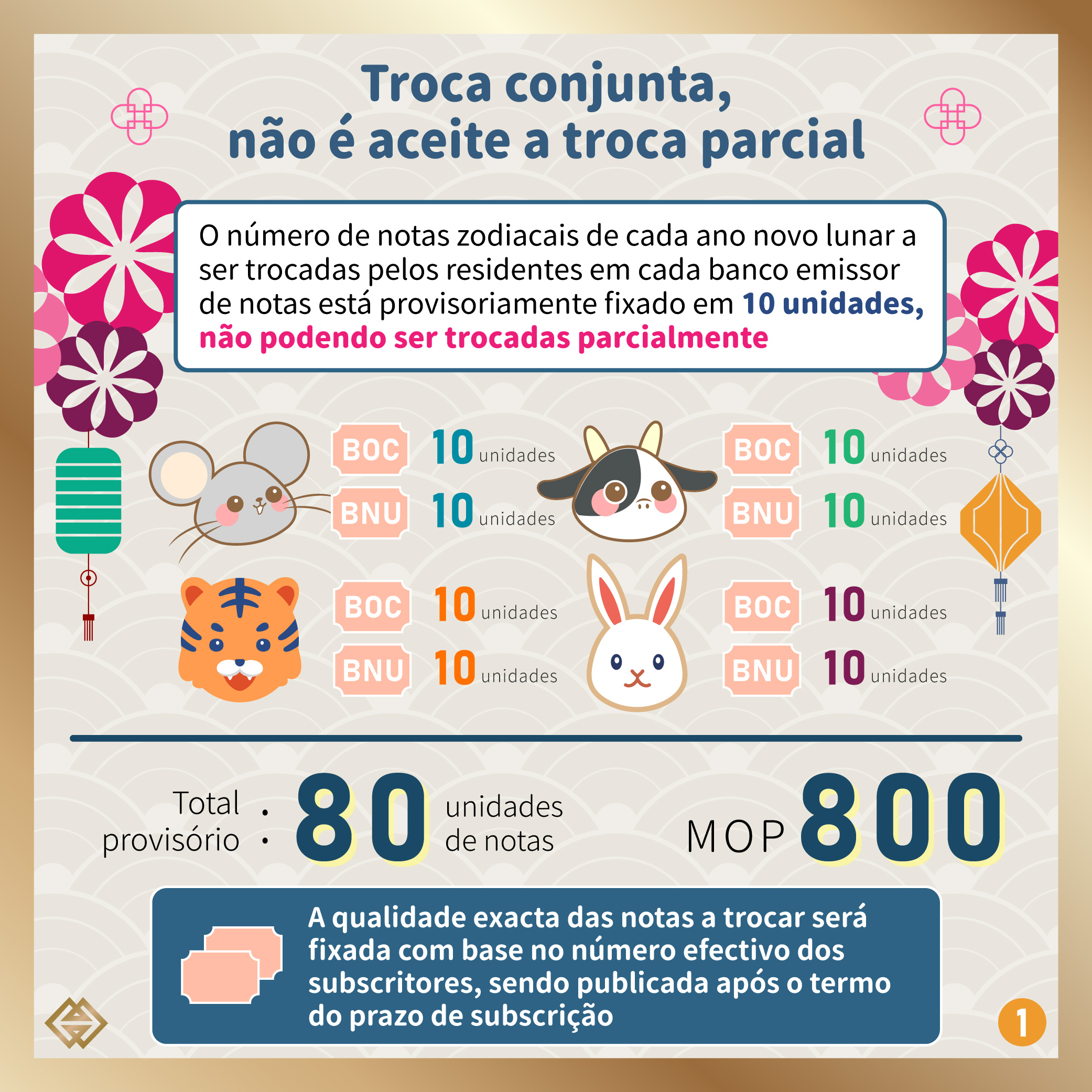 O número provisório de notas de cada ano zodiacal que cada banco emissor disponibiliza para troca, por cada residente, é fixado em 10 (dez) unidades, ou seja, o número total de notas a serem trocadas é de 80 (oitenta) unidades, com um montante de MOP800, não podendo ser subscritas parcialmente. O número concreto de notas a serem trocadas depende do número de subscrições, o mesmo será publicado após o termo do período de subscrição.