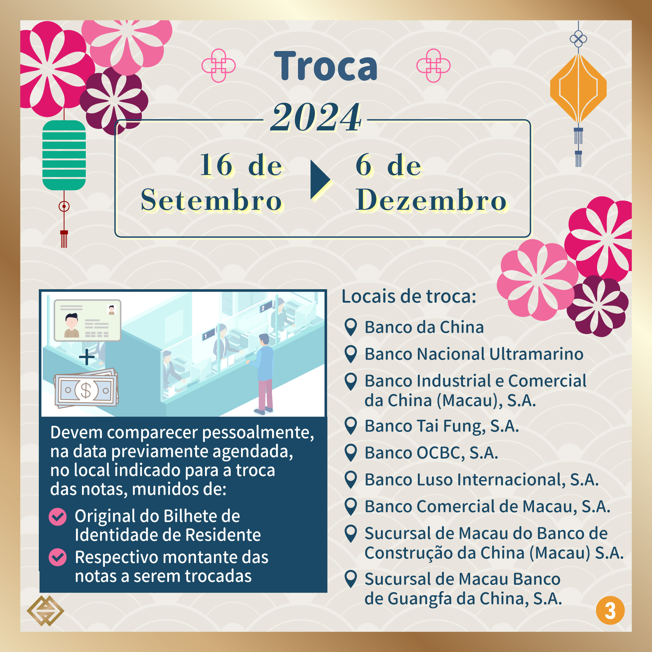 Ora, o período de troca decorre de 16 de Setembro a 6 de Dezembro de 2024. Assim, os residentes que tenham efectuado a subscrição para efeitos de troca pessoal ou no caso de designação de terceiros, devem comparecer, na data previamente agendada, no local indicado para a troca das notas, munidos dos documentos necessários e do respectivo montante das notas a serem trocadas. As informações detalhadas podem ser consultadas junto da página electrónica da AMCM: https://registration.amcm.gov.mo/banknotes/terms_pt.html. Para quaisquer esclarecimentos, favor contactar a linha aberta da AMCM durante o horário de expediente (telefone n.os 28565071/28565072)
