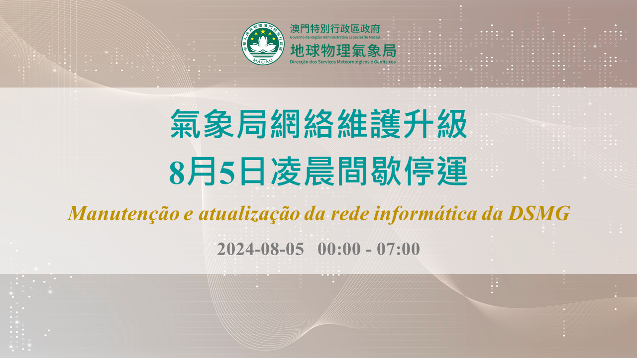 O sistema de rede da DSMG vai ser alvo de trabalhos de manutenção e actualização no dia 5 de Agosto (segunda-feira), entre as 00:00 horas e as 07:00 horas. Durante este período haverá interrupções intermitentes em determinados serviços de divulgação de informação. O serviço de consulta do sistema telefónico 1311 também sofrerá interrupções intermitentes. Os serviços voltarão ao normal assim que os trabalhos de manutenção e actualização forem concluídos. Pedimos desculpas por qualquer inconveniente causado.