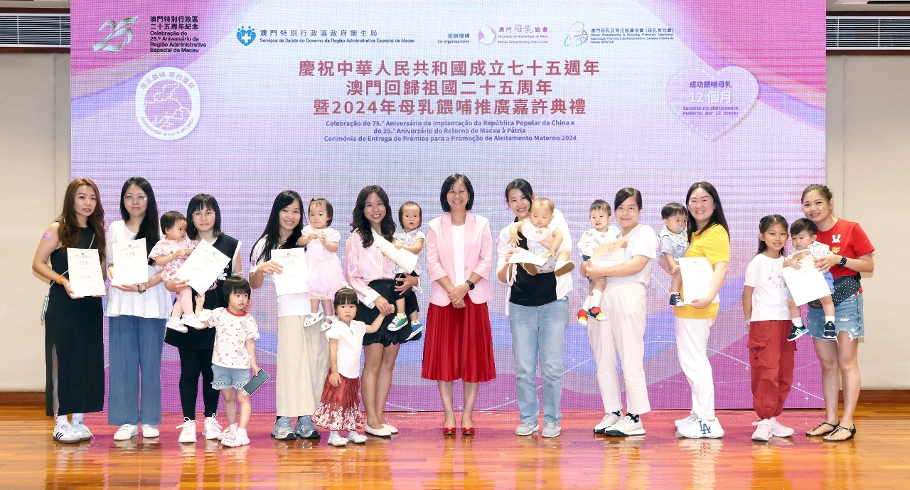 A “Cerimónia de Entrega de Prémios para a Promoção de Aleitamento Materno 2024”, organizada pelos Serviços de Saúde, com a colaboração da Associação de Amamentação de Macau e da Associação Promotora de Aleitamento e Cuidados Infantis de Macau, realizou-se nos últimos dias, com vista a assinalar a “Semana Internacional do Aleitamento Materno”. Estiveram presentes nesta cerimónia o Director dos Serviços de Saúde, Lo Iek Long, o Subdirector, Kuok Cheong U, o Subdirector, Chan Weng Wa, a Subdirectora, substituta, Loi I Leng, a Vice-Presidente do Conselho de Administração do Fundo de Segurança Social, Chan Pou Wan, bem como os representantes das 39 entidades públicas e privadas e das 3 escolas, e mais de 53 famílias (no total de cerca de 200 participantes).