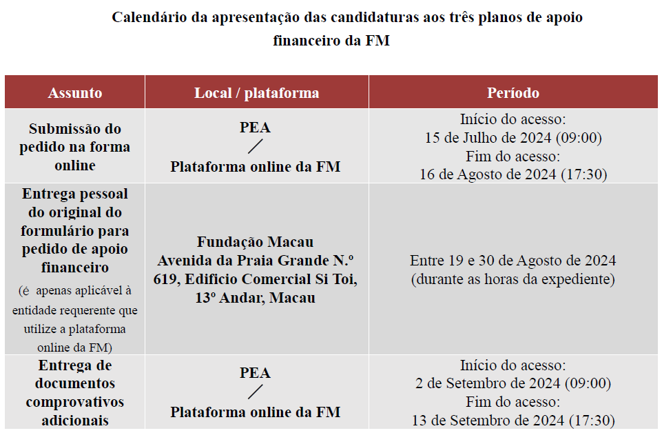 Os regulamentos e formulários relativos aos planos de apoio financeiro acima mencionados encontram-se disponíveis no website da FM (https://www.fmac.org.mo/sponsorship/). Os interessados devem ter uma conta válida de acesso à plataforma online, preencher e submeter o formulário de candidatura até ao próximo dia 16 de Agosto, às 17h30. Para as requerentes na PEA, deverão eles efectuar, em simutâneo, o reconhecimento facial. Em relação às requerentes que se socorrem da plataforma online da FM, estes deverão apresntados, entre 19 e 30 de Agosto e pessoalmente o original dos documentos necessários à instrução da candidatura, nomeadamente os formulários assinados por parte dos representantes legais ou pessoas à quem conferem competência e carimbados. A FM está a lançar apelo aos interessados para efectuarem a candidatura o mais breve possível, actualizando a sua conta na plataforma online para o efeito, e comunica que não será aceite qualquer candidatura apresentada extemporaneamente.