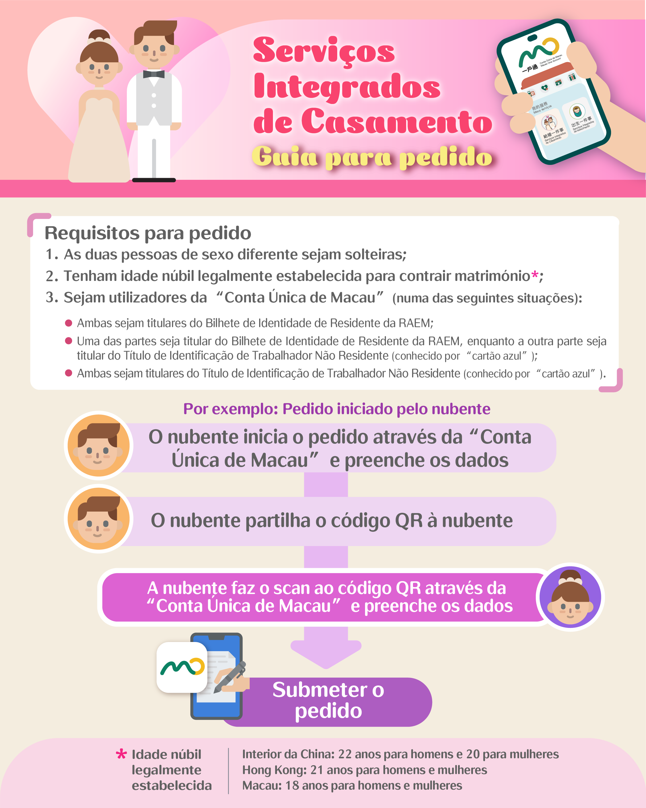 Os nubentes que reúnam os devidos requisitos podem, mediante os “Serviços Integrados de Casamento”, tratar do pedido de casamento, da marcação da data de casamento, da actualização do estado civil do bilhete de identidade e do pedido de subsídio de casamento. Os nubentes podem, ainda, optar que a cerimónia de casamento seja presidida pelo conservador da Conservatória do Registo Civil, ministro de culto da igreja ou notário privado. Por outro lado, caso os nubentes optem para que a cerimónia de casamento seja presidida pelo conservador, no próprio dia do registo de casamento podem actualizar os dados do estado civil constantes no Bilhete de Identidade de Residente de Macau e levantar a certidão de casamento. Os “Serviços Integrados de Casamento” permitem aos nubentes tratarem de várias formalidades administrativas referentes ao casamento de uma só vez, evitando várias deslocações a diferentes serviços.