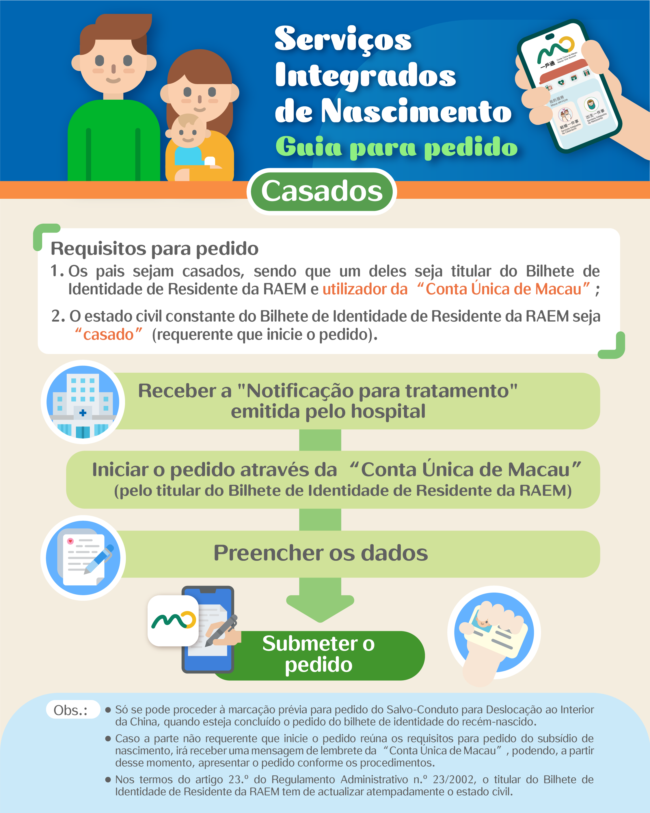 Os pais de recém-nascidos que reúnam os devidos requisitos, depois de receberem a “Notificação para tratamento” (na qual consta a data para o tratamento do registo de nascimento) emitida pelo hospital, podem, imediatamente, através dos “Serviços Integrados de Nascimento”, tratar do registo de nascimento, do bilhete de identidade dos recém-nascidos, da actualização dos dados constantes no Cartão informatizado dos Serviços de Saúde (também designado por “Cartão de Utente”), do pedido do subsídio de nascimento e da marcação para o pedido do Salvo-Conduto para Deslocação ao Interior da China. Os “Serviços Integrados de Nascimento” permitem aos pais dos recém-nascidos tratarem de uma só vez os diversos serviços referentes ao nascimento dos seus filhos, reduzindo as deslocações aos serviços públicos para apresentar os documentos e acelerando o tempo de tratamento dos respectivos documentos.