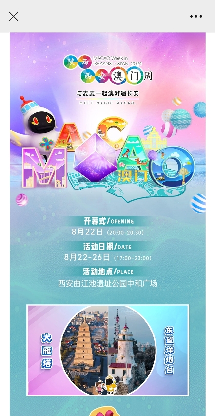 A DST criou uma página temática para a “Semana de Macau em Xi’an•Shaanxi” (https://www.macaotourism.gov.mo/en/article/promotion/macao-week-in-shaanxi-xian-2024). O público é convidado a visitar a página temática e a seguir as contas oficiais da DST no WeChat, Weibo, Xiaohongshu e Douyin para obter mais informações sobre as actividades da “Semana de Macau em Xi’an•Shaanxi”.