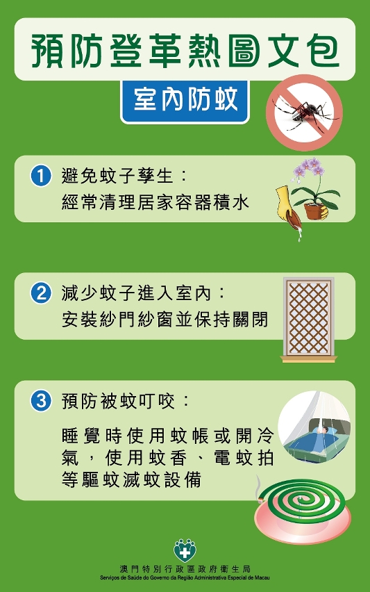 Macau encontra-se na época de alto risco de disseminação da Febre de Dengue nas regiões vizinhas, nomeadamente Zhuhai e Hong Kong, pelo que os Serviços de Saúde apelam aos residentes para reforçarem as medidas de prevenção de mosquitos e recorrerem, o mais rápido possível, à consulta médica caso apresentem sintomas suspeitos.