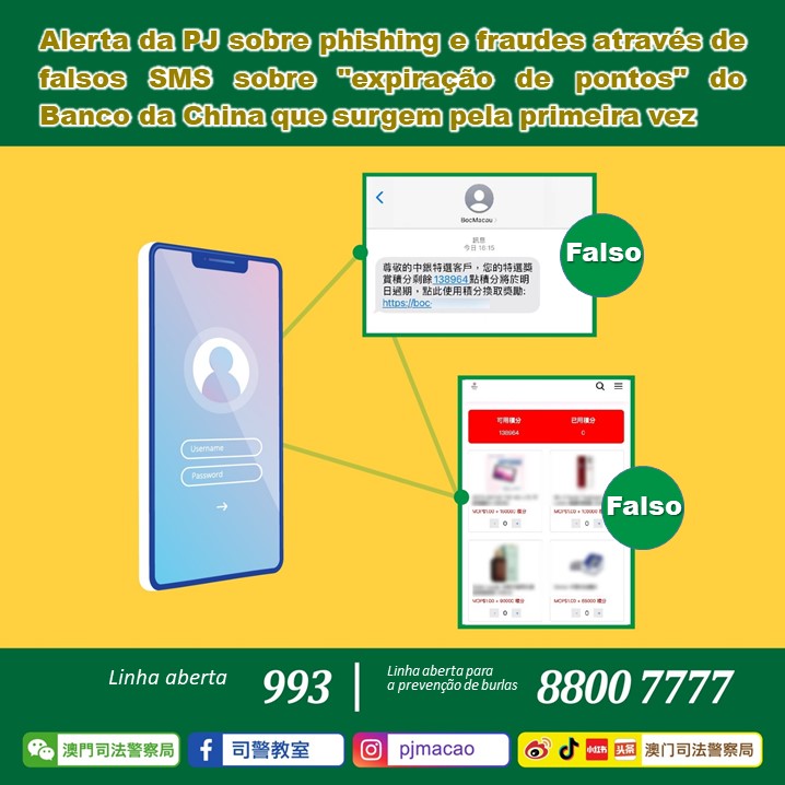 Recentemente e pela primeira vez, a Polícia Judiciária descobriu que burlões que se fazem passar pelo “Banco da China” enviando mensagens falsas aleatórias aos cidadãos, alegando que “os pontos do cliente estão prestes a expirar” e induzem as pessoas a clicar num link indicado nesta mensagem. Ao fazê-lo, entra-se para um website falso do “Banco da China”, onde é solicitado aos cidadãos que insiram os dados do cartão de crédito para trocar os pontos por presentes a um custo baixo. Assim, os burlões roubam informações dos cartões de crédito para realizar transacções de elevado valor não autorizadas.