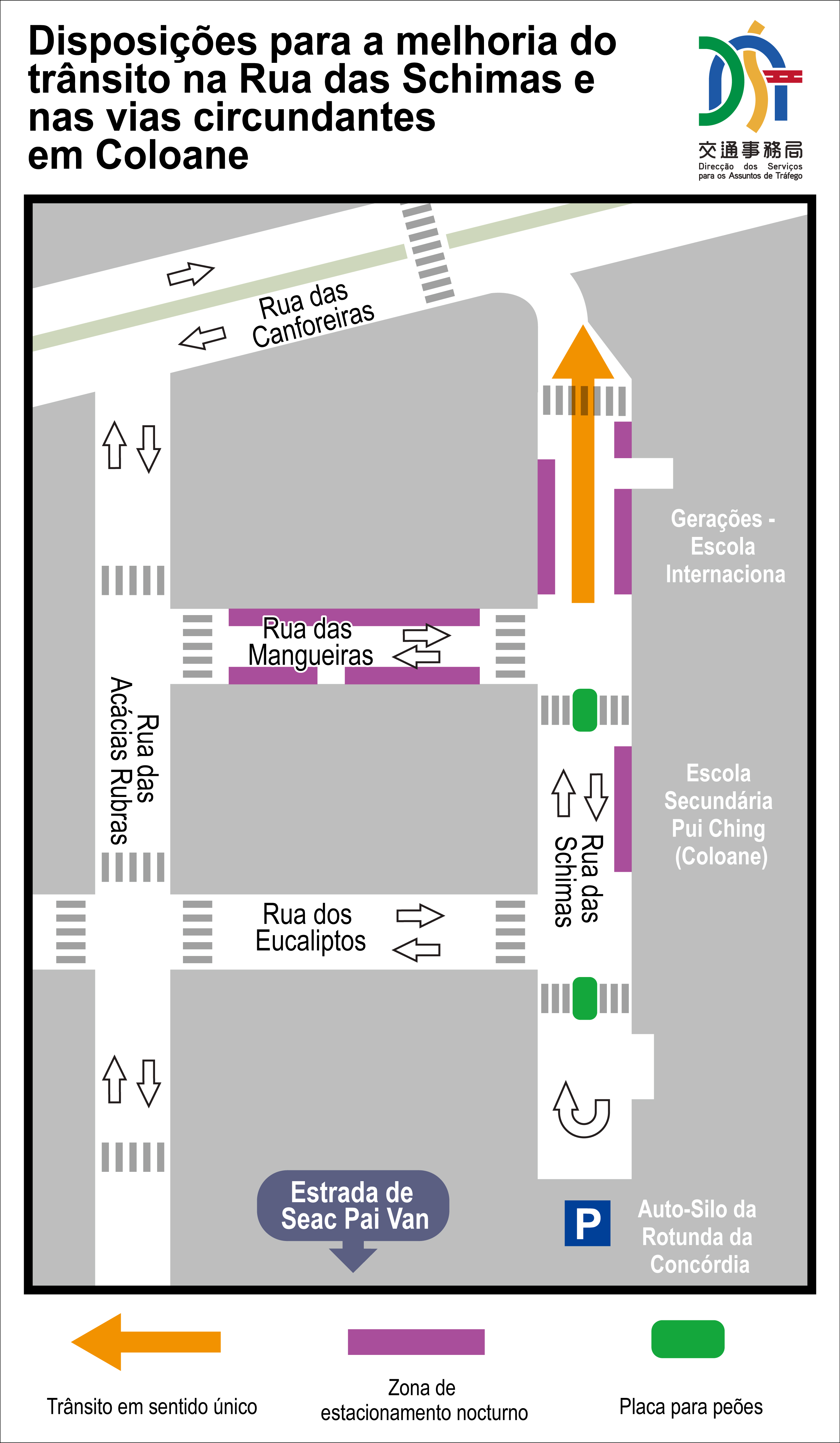 Em paralelo, em resposta à inauguração de novas instalações escolares este ano, a DSAT optimizou as instalações de trânsito e apoio nas áreas circundantes. Por exemplo, na Taipa, será implementado, a título experimental, o sentido único de circulação num troço da Rua do Minho entre a Rua de Sai On e a Rua de Bragança, bem como na Rua de Sai On. Serão simultaneamente ajustadas as localizações de alguns cruzamentos com prioridade de passagem e de passadeiras, bem como aumentadas as zonas de tomada e largada de passageiros e mercadorias, com o objectivo de melhorar a ordem rodoviária. Considerando que alguns pais e condutores possam não estar familiarizados com as novas medidas de trânsito nos primeiros dias do ano lectivo, a DSAT e a DSEDJ irão reforçar a divulgação das informações relevantes, e o CPSP destacará mais agentes para o controlo do trânsito no local. Além disso, em articulação com a abertura de duas novas escolas em Coloane, a DSAT optimizou a organização do trânsito na Rua das Schimas e nas vias circundantes, bem como o ambiente pedonal nas imediações da escola na Rua de Afonso de Albuquerque, com o intuito de aperfeiçoar a ordem de travessia de peões e de circulação de veículos. Simultaneamente, procedeu-se ao ajuste dos lugares de estacionamento para aumentar a visibilidade entre condutores e peões nas proximidades das passadeiras, reforçando assim a segurança dos docentes e alunos ao atravessarem a rua.