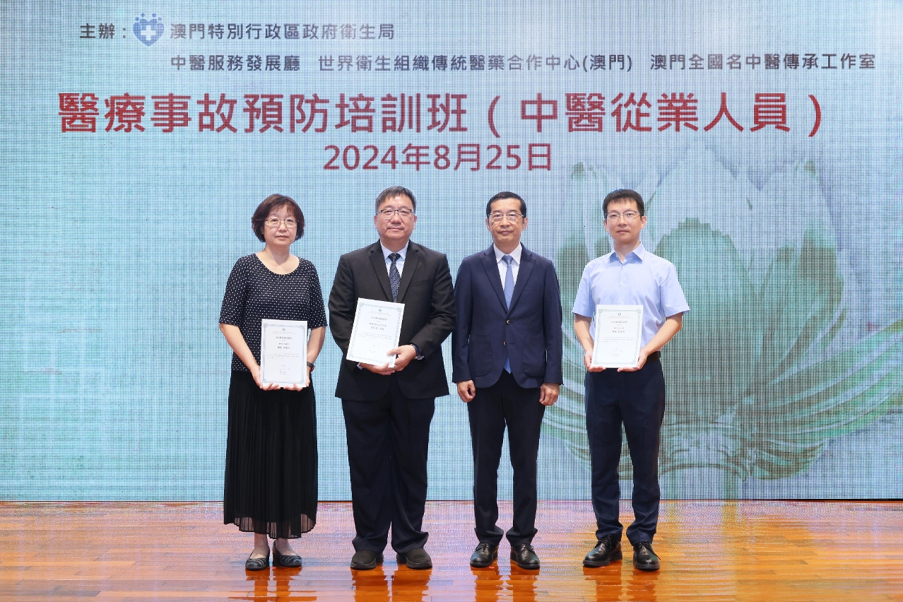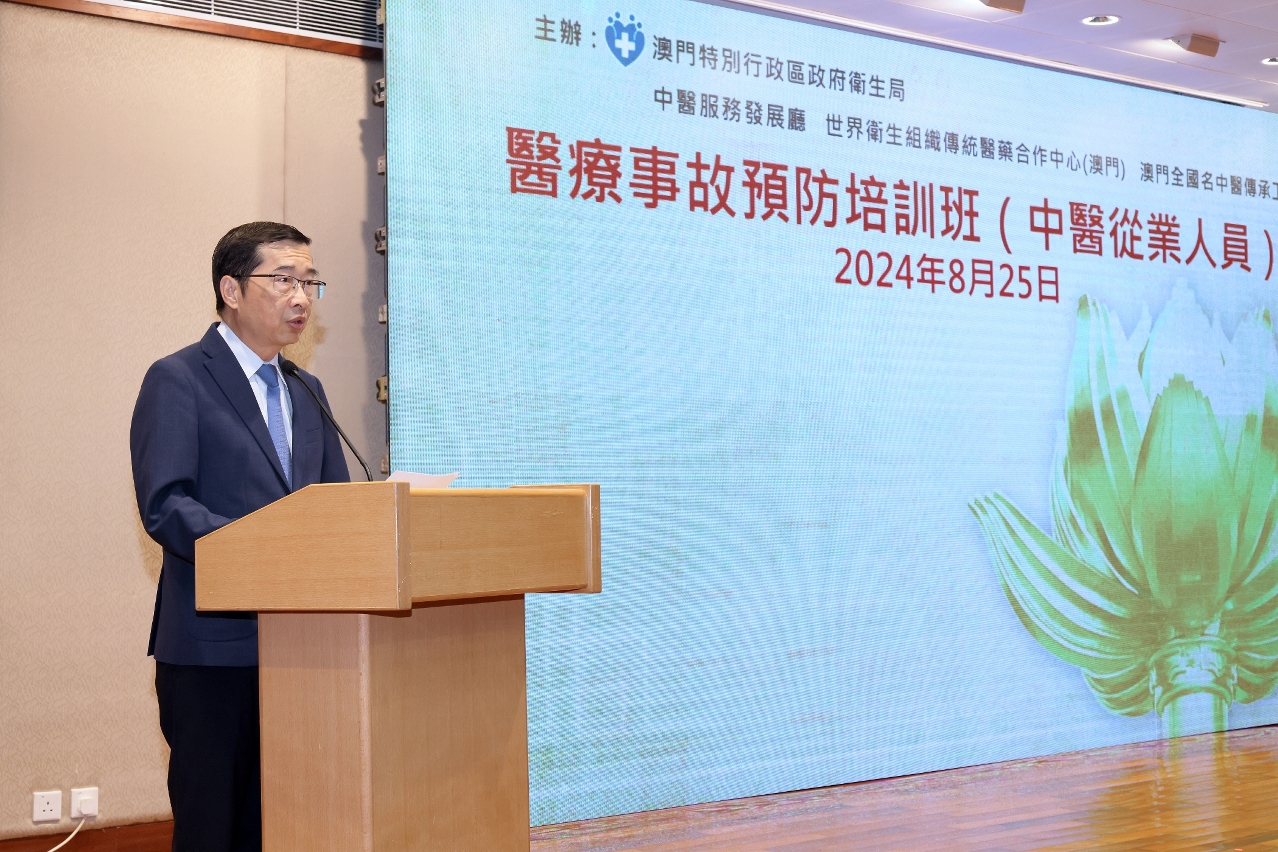 Com vista a elevar a qualidade dos serviços médicos prestados pelos profissionais da medicina tradicional chinesa de Macau, e prevenir a ocorrência de erros médicos, o Departamento de Desenvolvimento dos Serviços de Medicina Tradicional Chinesa dos Serviços de Saúde do Governo da Região Administrativa Especial de Macau, o Centro de Cooperação de Medicina Tradicional da Organização Mundial da Saúde (Macau), o Estúdio de transmissão por médico experiente reconhecido a nível nacional em Medicina Tradicional Chinesa (Macau) realizaram em conjunto, o “Curso de Formação em Prevenção de Erros Médicos – Profissionais da Medicina Tradicional Chinesa”. Foram convidados como oradores, o presidente da Comissão de Perícia do Erro Médico, Dr. Pang Heong Keong, o Professor Adjunto da Universidade de Ciência e Tecnologia de Macau, Dr. Chen Min, e a médica de medicina tradicional chinesa do Hospital da Universidade de Ciência e Tecnologia de Macau, Dra. Yang Lu, partilhando e trocando opiniões com o sector da medicina tradicional chinesa sobre os temas “Discussão sobre o erro médico - medicina tradicional chinesa”, “Normas operacionais de acupunctura e prevenção de riscos” e “Breve abordagem sobre os efeitos secundários e a resposta clínica da medicina tradicional chinesa e da acupunctura”, entre outros. O Subdirector dos Serviços de Saúde, Dr. Cheang Seng Ip e a Directora do Centro de Cooperação de Medicina Tradicional da OMS (Macau), Dra. Mo Hui participaram e presidiram a esta actividade, a qual contou com 172 profissionais de medicina tradicional chinesa de Macau.
