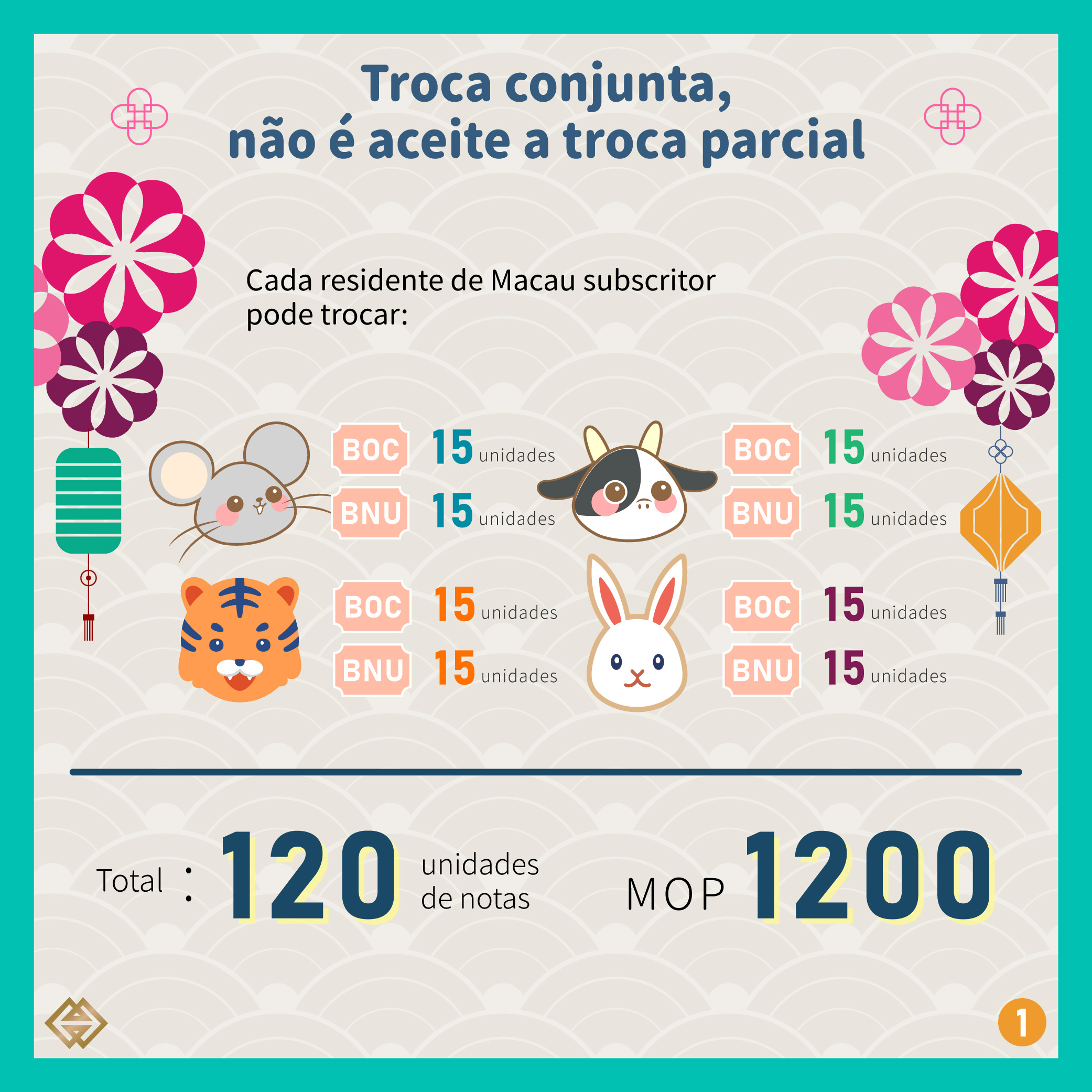 As notas zodiacais dos Anos Lunares do Rato, do Búfalo, do Tigre e do Coelho emitidas pelos dois bancos emissores estarão disponíveis para troca a partir de hoje (dia 16) até ao dia 6 de Dezembro de 2024. Os residentes de Macau que efectuaram a subscrição para efeitos de troca devem fazer-se acompanhar do original do seu bilhete de identidade de residente e comparecer, na data previamente agendada, na agência indicada para a troca das notas, sendo que o número de cada tipo de notas zodiacais dos Anos Lunares do Rato, do Búfalo, do Tigre e do Coelho que cada banco emissor disponibilizará para troca, por cada residente de Macau subscritor, é de 15 (quinze) unidades, pelo que as referidas notas disponíveis para troca totalizam 120 (cento e vinte) unidades, cujo valor envolvido ascende a mil e duzentas patacas.