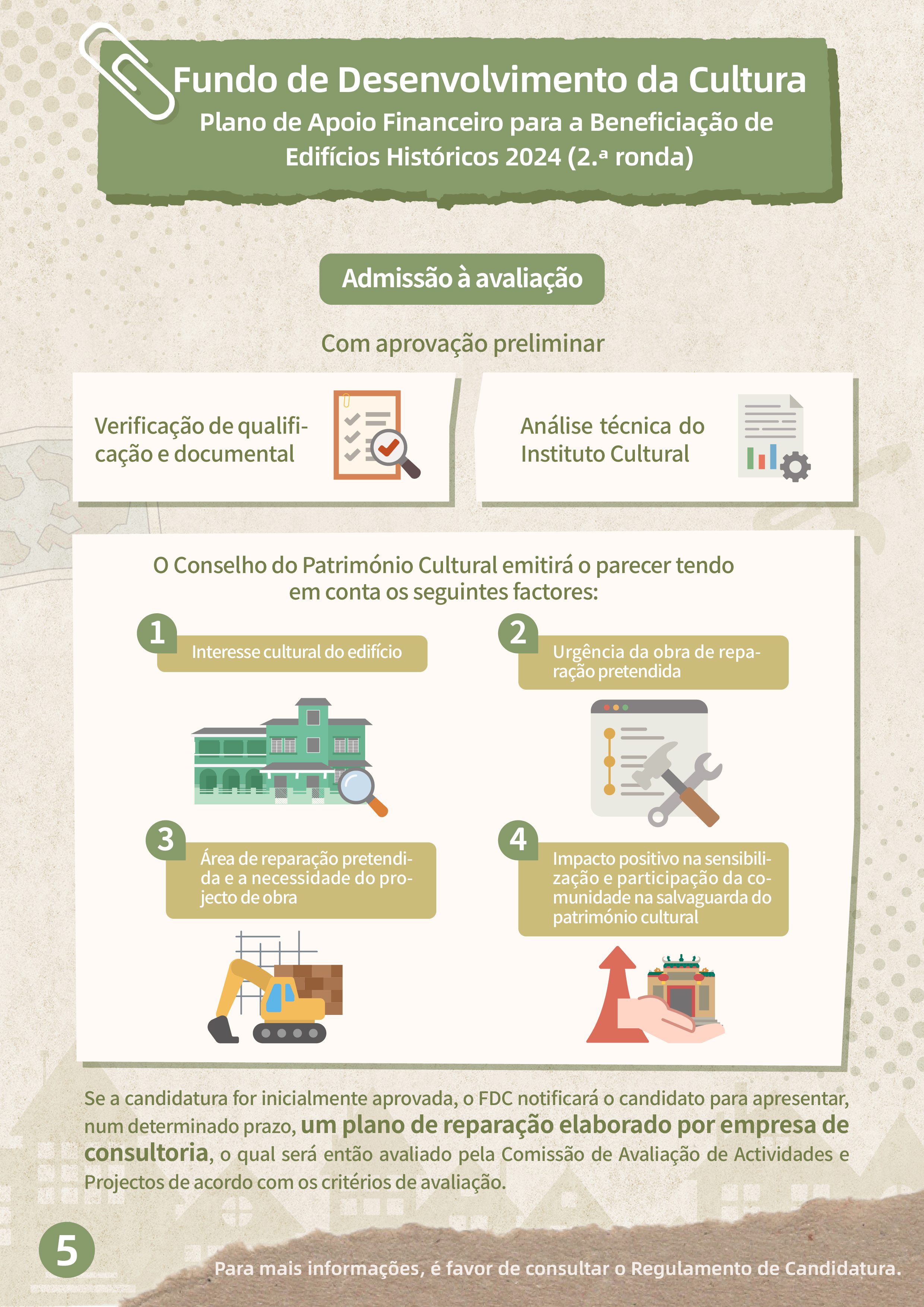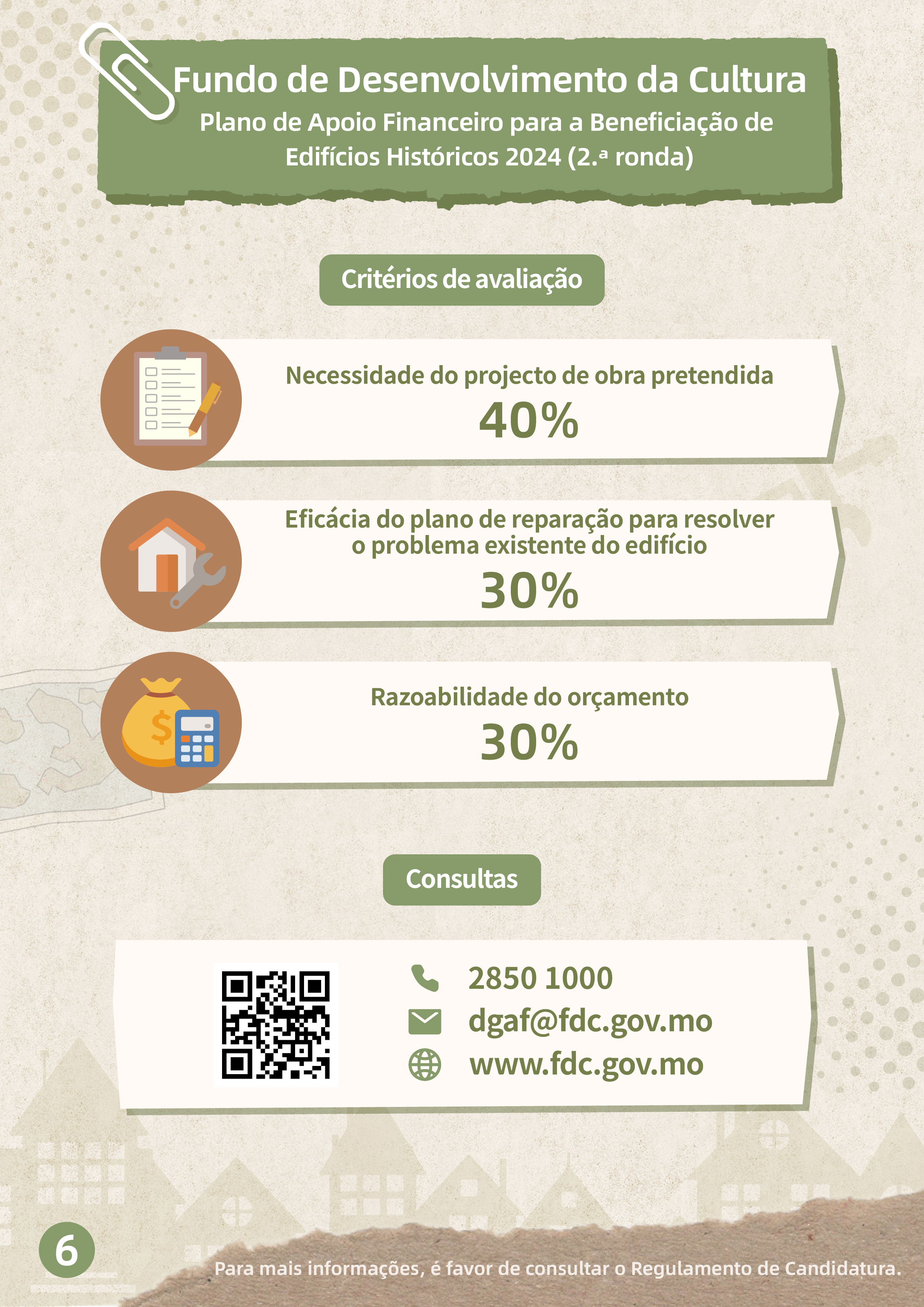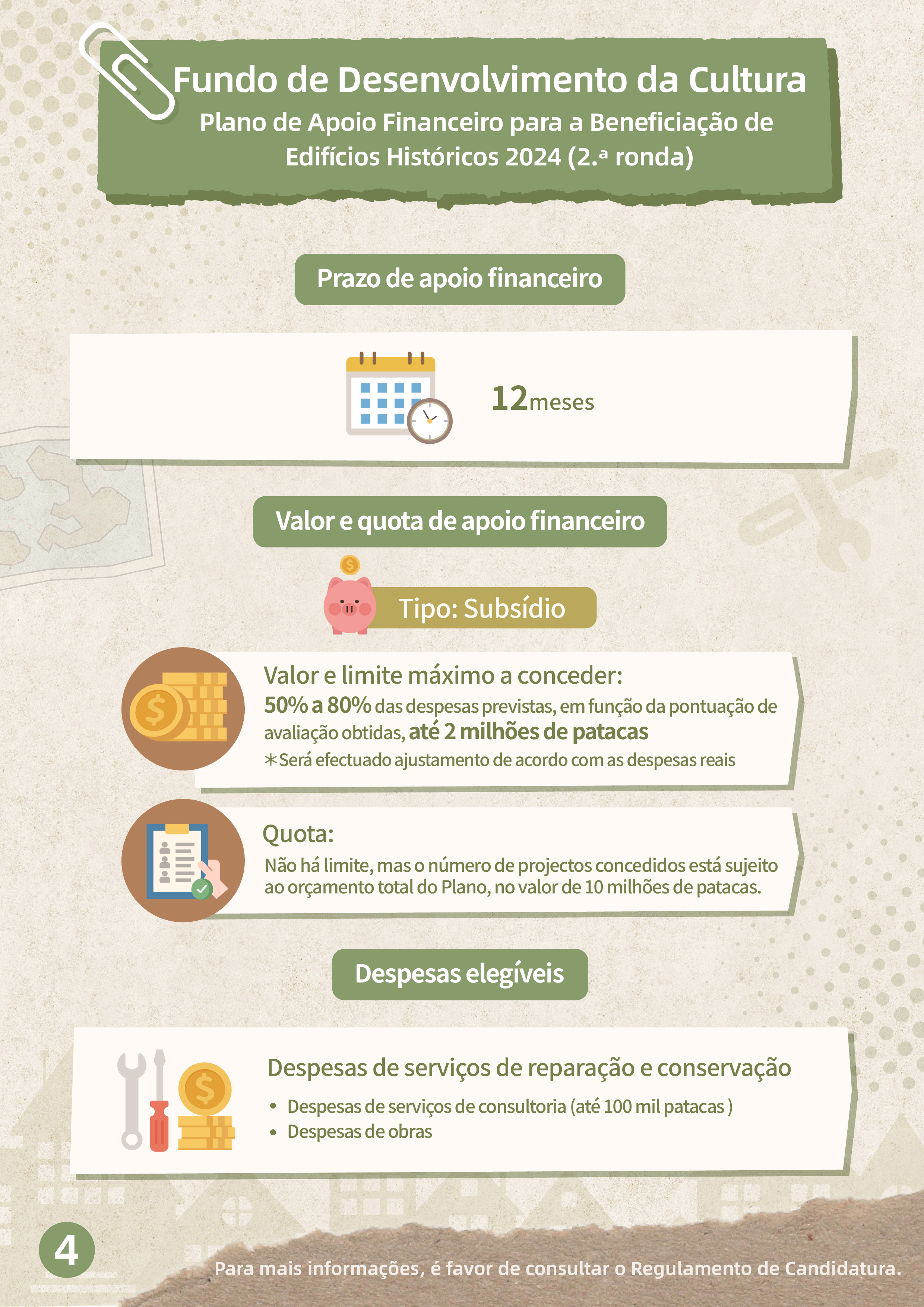Por outro lado, serão aceites candidaturas, de 24 de Setembro a 22 de Novembro, à 2.ª ronda do “Plano de apoio financeiro para a beneficiação de edifícios históricos 2024”, para apoiar os proprietários de edifícios classificados e privativos, e de interesse cultural na realização de inspecções ou testes estruturais regulares, de reparação externa, bem como, de restauro e reparação necessários de acordo com os resultados dos testes. O âmbito de apoio financeiro inclui os bens imóveis classificados, em vias de classificação e de interesse cultural para os quais ainda não tenham sido iniciadas obras de reparação antes do início do período de candidatura, devendo as candidaturas ser apresentadas pelos proprietários ou procuradores dos bens imóveis. O apoio financeiro é sob a forma de subsídio que varia entre 50% e 80% das despesas previstas, com um limite máximo de 2 milhões de patacas, por um período de apoio financeiro de 12 meses, sendo o orçamento total deste Plano de 10 milhões de patacas.