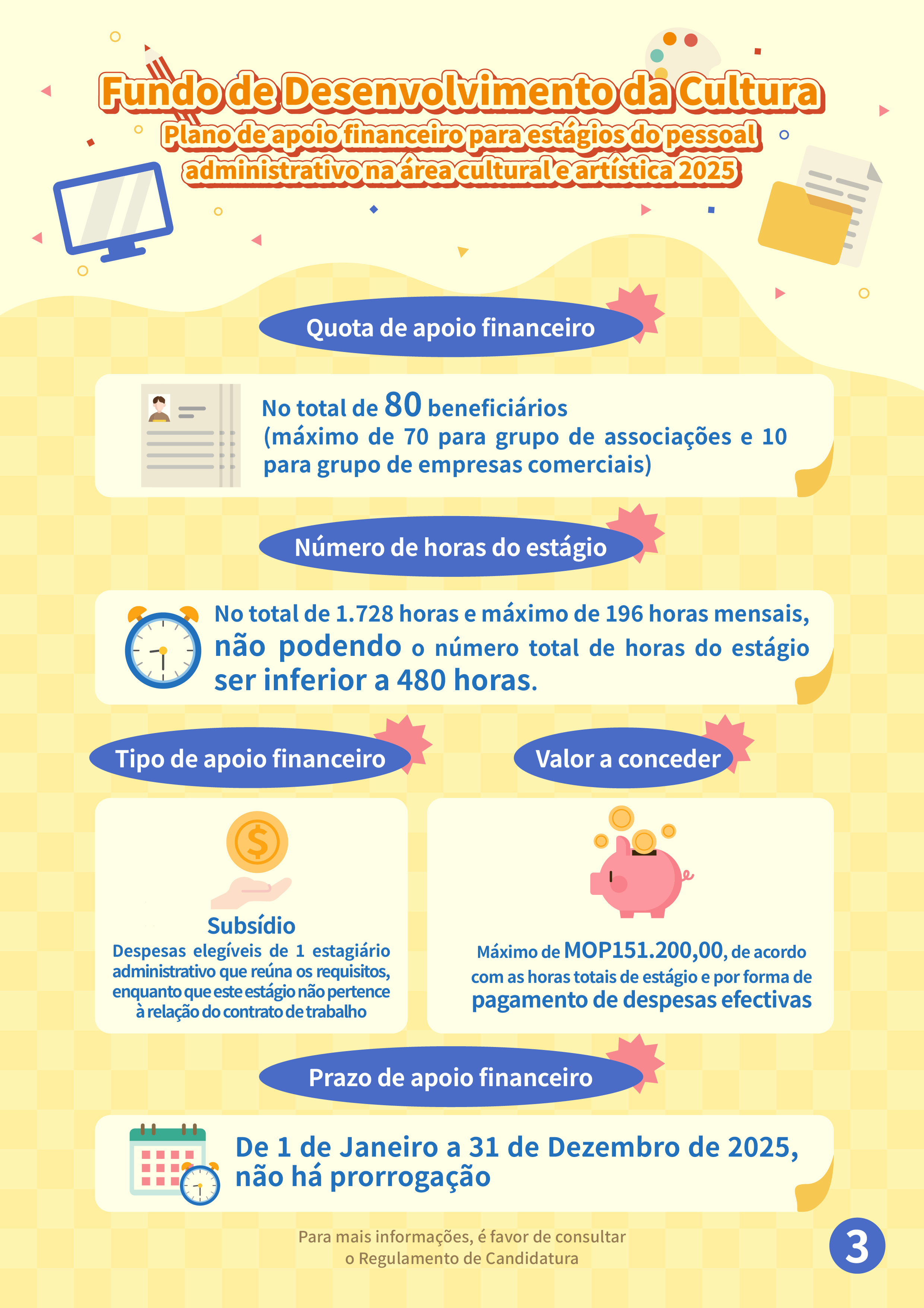 Com vista a apresentar em detalhe os assuntos sobre as candidaturas ao “Plano de apoio financeiro para estágios do pessoal administrativo na área cultural e artística 2025” e responder às dúvidas dos candidatos, será realizada uma sessão de esclarecimento no dia 3 de Outubro, às 17h00, no Auditório situado no 7.º andar do Edifício Centro Comercial Cheng Feng (Endereço: Alameda Dr. Carlos d’Assumpção 322-362), podendo os interessados inscrever-se na página electrónica do FDC (www.fdc.gov.mo): “Sistema de marcação” no âmbito da “Área dos serviços electrónicos e de descarregamento”. Para quaisquer consultas, é favor de contactar-nos através do telefone, n.º 2850 1000 ou por email, ac@fdc.gov.mo.