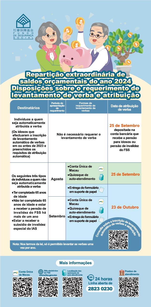 Os idosos que efectuaram a inscrição de levantamento automático e que preencham os requisitos de atribuição, bem como os três tipos de indivíduos (incluindo os idosos com idade igual ou superior a 65 anos, os idosos que não tenham completado 65 anos de idade e estejam a receber a pensão de invalidez há mais de um ano, e os indivíduos que estão a receber o subsídio de invalidez especial do Iinstituro de Acção Social) que efectuaram, em Agosto, o requerimento de levantamento de verba através dos meios electrónicos, tais como da “Conta Única de Macau” ou dos quiosques de auto-atendimento, a verba da subconta de gestão do Governo autorizada será depositada em 25 de Setembro na conta bancária indicada. Enquanto os outros indivíduos que efectuaram o requerimento de levantamento de verba em suporte de papel em Agosto ou que apresentaram requerimentos em Setembro, a verba será depositada, o mais cedo em 23 de Outubro, na conta bancária indicada.