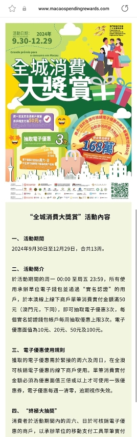 Para aumentar a atractividade da actividade, durante o decorrer da actividade, os consumidores participarão automaticamente no Grande Sorteio Final com prémios no valor total superior a 1,68 milhões a realizar após o fim da actividade, desde que paguem efectivamente 50 patacas com a carteira electrónica de uma das entidades colaboradoras numa transacção em qualquer uma das lojas de Macau que aceitem os cupões de desconto electrónicos.