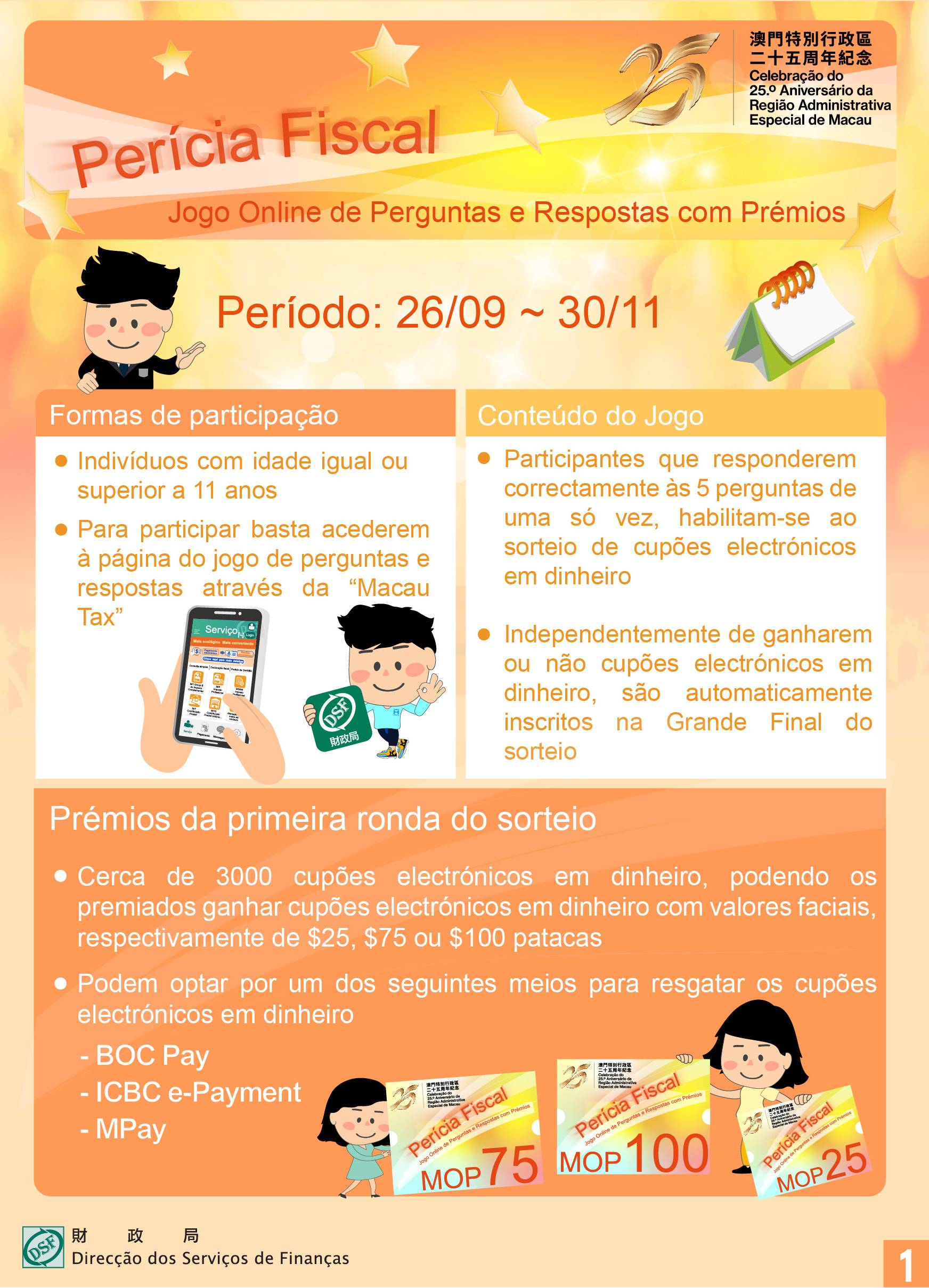Para celebrar o 25.º Aniversário do Retorno de Macau à Pátria, a Direcção dos Serviços de Finanças lança, no período de 26 de Setembro a 30 de Novembro, o jogo “Perícia Fiscal” Jogo Online de Perguntas e Respostas com Prémios, esperando que os cidadãos através do mesmo possam aprofundar os conhecimentos no âmbito da legislação fiscal, bem como incentivá-los a tratar das formalidades fiscais através da aplicação móvel “Macau Tax” destes Serviços, e assim, festejar juntamente com o público o aniversário do retorno de Macau à Pátria.