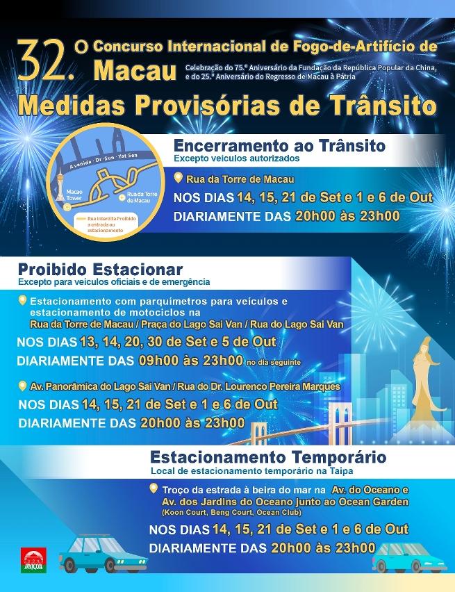Infografia sobre medidas provisórias de trânsito do evento “Celebração do 75.º Aniversário da Fundação da RPC e do 25.º Aniversário do Regresso de Macau à Pátria - 32.° Concurso Internacional de Fogo-de-Artifício de Macau”