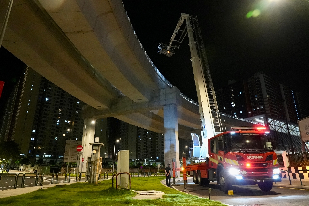 Com o objectivo de intensificar as medidas de contingência e o mecanismo de comunicação e coordenação com a Sociedade do Metro Ligeiro de Macau, S. A. em caso de emergência, o Corpo de Bombeiros (CB) realizou, na madrugada do dia 8 de Outubro do corrente ano, um exercício conjunto de combate a incêndios com a sociedade acima mencionada na Linha Seac Pai Van do metro ligeiro.