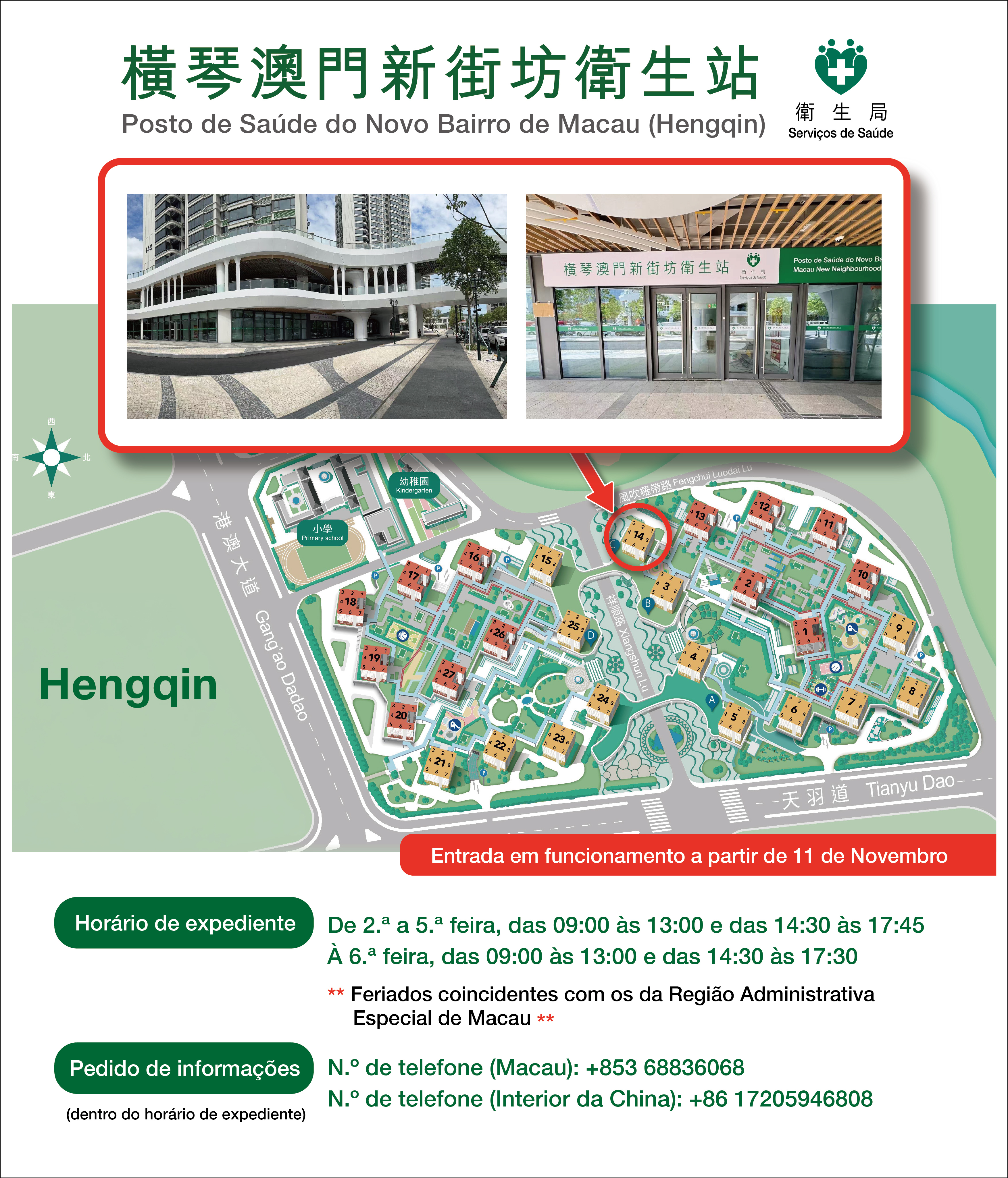 O Posto de Saúde ocupa uma área de 1.000 metros quadrados, entrará em funcionamento a partir do dia 11 de Novembro (segunda-feira), tomando como referência o modelo de funcionamento do centro de saúde da RAEM, são prestados, numa primeira fase, os serviços de medicina ocidental, tais como cuidados de saúde para adultos, mulher, crianças, consulta externa não marcada, incluindo principalmente o tratamento de doenças crónicas comuns (por exemplo, hipertensão) e de doenças agudas comuns (por exemplo, constipação e febre); Caso o doente necessite de acompanhamento médico especializado, serão encaminhados para o Centro Hospitalar Conde de São Januário (CHCSJ) ou para o Hospital Macau Union de acordo com o modelo actual. Além disso, em caso de emergência médica, o doente será transferido para a filial de Hengqin do Hospital n.º 1 da Universidade de Medicina de Guangzhou na Zona de Cooperação Aprofundada para tratamento urgente. O tratamento subsequente pode ser efectuado de acordo com a vontade do doente, será encaminhado para hospitais da RAEM para tratamento médico posterior, sempre que a situação clínica o permita.