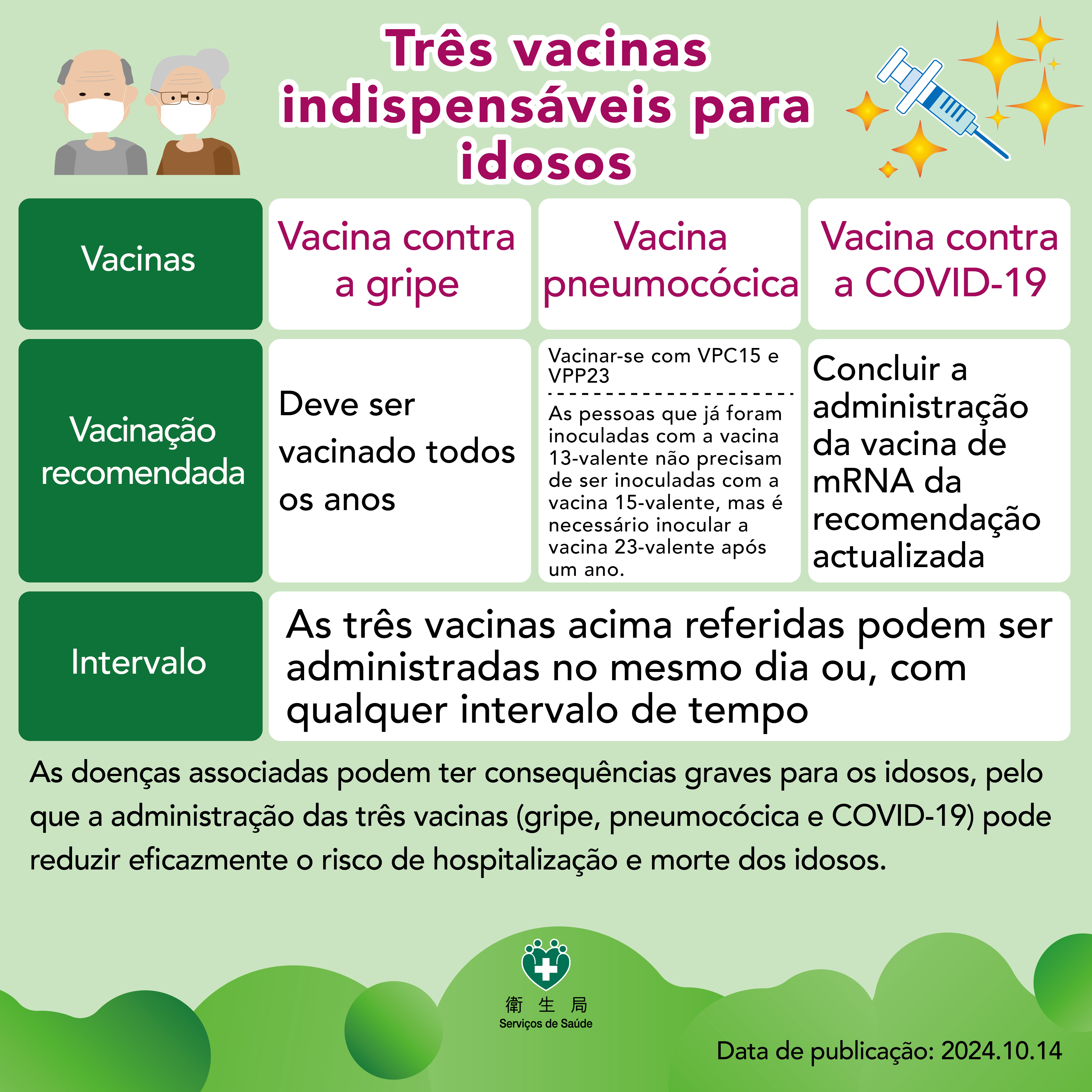 Com a aproximação do Inverno, prevê-se que os casos de infecções respiratórias sejam aumentados e que os idosos, grávidas, crianças e doentes crónicos tenham maior risco de sofrer complicações graves e morte após terem sido infectados pela gripe. Além disso, a vacina antigripal só produz anticorpos suficientes no mínimo duas (2) a três (3) semanas, após a sua administração. Neste sentido, os Serviços de Saúde apelam aos indivíduos de alto risco para se submeterem com a maior brevidade possível à vacina antigripal. Os mesmos continuam a ser destinatários com prioridade à vacinação, sem necessidade de marcação prévia. A sua administração pode ser efectuada após a avaliação feita nos postos de vacinação; os demais residentes de Macau devem efectuar a marcação prévia para a vacinação nos centros de saúde/posto de saúde.