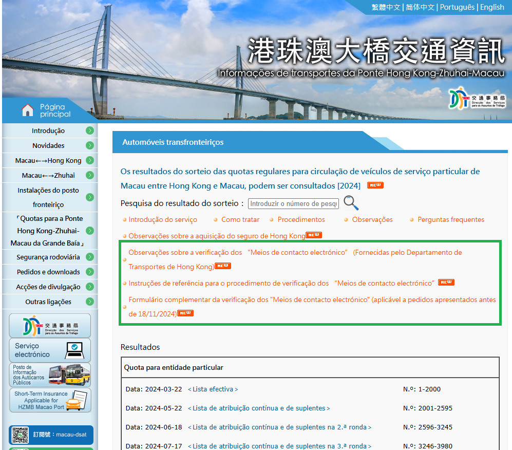 Relativamente ao novo pedido de atribuição de quota regular para a circulação de veículos particulares de Macau entre Hong Kong e Macau, deve-se proceder à fase de verificação do meio de contacto electrónico nos três meses anteriores à data prevista de entrada em vigor da licença de Hong Kong. Os requerentes podem, a partir do dia 18 de Novembro, através do serviço de consulta do estado do pedido na página electrónica da Direcção dos Serviços para os Assuntos de Tráfego (https://www.dsat.gov.mo/web_sp_status/services_status.aspx?lang=pt ), conhecer a data prevista de entrada em vigor da licença de Hong Kong, a qual será divulgada após a aprovação da parte de Macau e a entrega dos documentos às autoridades de Hong Kong. Se o número de telemóvel ou o correio electrónico não for confirmado, as autoridades de Hong Kong não irão tratar do pedido. Por isso, os requerentes devem proceder à verificação do meio de contacto electrónico dentro do prazo fixado , e em caso de atraso, precisam de tratar de novo as formalidades de verificação.