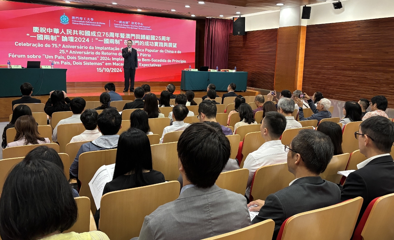 Para celebrar o 75.º aniversário da implantação da República Popular da China e o 25.º aniversário do estabelecimento da Região Administrativa Especial de Macau, e fazer um balanço das experiências de Macau na implementação bem-sucedida do princípio “Um País, Dois Sistemas” e na sua concretização, o Centro de Estudos “Um País, Dois Sistemas” da Universidade Politécnica de Macau (UPM) organizou o “Fórum sobre ‘Um País, Dois Sistemas’ 2024: Implementação Bem-Sucedida do Princípio ‘Um País, Dois Sistemas’ em Macau e Suas Expectativas”, contando com a presença de cerca de 100 especialistas, académicos e estudantes do Interior da China e de Macau.