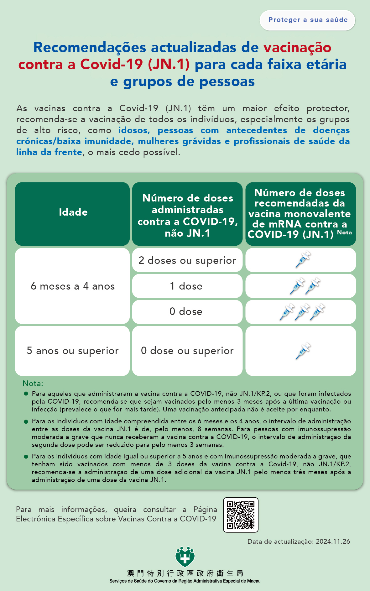 - Recomenda-se que as pessoas que tenham sido recentemente inoculadas vacina não JN.1 (tal como vacina XBB) ou infectadas pelo SARS-CoV-2, sejam vacinadas três (3) meses após a sua última vacinação ou infecção (prevalece o que ocorreu mais tarde).