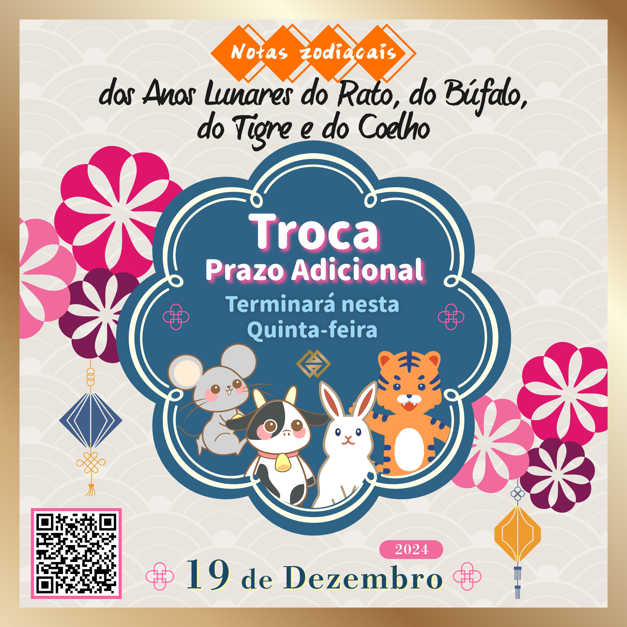 O termo do prazo adicional para troca das notas zodiacais dos quatro anos lunares passados (incluindo os anos do Rato, do Búfalo, do Tigre e do Coelho) decorrerá até 19 de Dezembro de 2024 (Quinta-feira), a AMCM informa que os residentes que procederam à subscrição “on-line” e que não efectuaram a troca das mesmas devam proceder, até ao termo do prazo, à troca das notas, nos locais de troca previamente escolhidos.