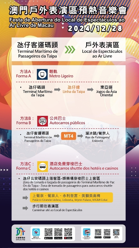 Em articulação com a saída das pessoas após o espectáculo, os serviços de autocarros e do metro ligeiro serão ajustados provisoriamente, de modo a elevar ainda mais a eficiência do transporte. Na altura, serão disponibilizadas duas carreiras de autocarros de ligação gratuitas, respectivamente para a Praça de Ferreira do Amaral e as Portas do Cerco; O metro ligeiro adoptará a medida de triagem, a estação “Jogos da Ásia Oriental” vai em direcção ao Posto Fronteiriço Hengqin, à Vila da Taipa e à Barra, e a estação “Cotai Leste” vai ao Aeroporto e ao Terminal Marítimo de Passageiros da Taipa; No Terminal Marítimo de Passageiros da Taipa, os passageiros podem apanhar o autocarro n.º 103X para se dirigirem ao Posto Fronteiriço de Macau da Ponte Hong Kong-Zhuhai-Macau. Além disso, os espectadores podem ainda deslocar-se a pé até aos complexos de entretenimento em redor e sair do local através de táxi ou autocarros shuttle dos hotéis e casinos. Apelamos aos espectadores que, ao saírem do recinto, prestem atenção à sinalização no local e sigam as instruções dos trabalhadores, escolhendo o meio de transporte adequado para o destino pretendido.