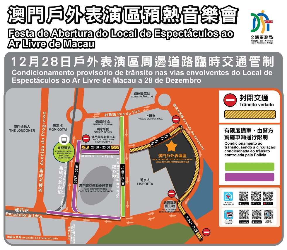 O Local de Espectáculos ao Ar Livre de Macau vai receber a primeira actuação na noite de 28 de Dezembro, estando prevista a participação de 15 mil espectadores. O espectáculo terá entrada a partir das 16h00, terminando por volta das 21h00. Em articulação com a organização do espectáculo e a deslocação do público ao local, serão tomadas as medidas provisórias de trânsito nas vias envolventes do local de espectáculos, bem como ajustados, temporariamente, os serviços de transportes públicos para escoar o fluxo de pessoas. A Direcção dos Serviços para os Assuntos de Tráfego (DSAT) recomenda aos espectadores que utilizem, tanto quanto possível, os transportes públicos colectivos para se deslocarem ao local de espectáculos, prestando atenção às informações mais actualizadas sobre o trânsito e planeando antecipadamente as suas viagens.