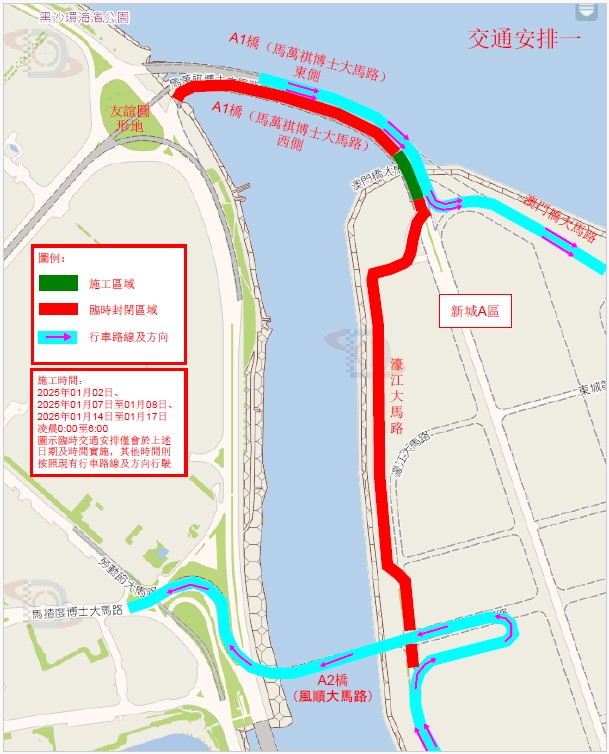 Será encerrada toda a faixa de rodagem do lado leste da via de acesso A1, passando a faixa de rodagem do lado oeste da via de acesso A1 a ser em dois sentidos, podendo os veículos circular pela faixa de rodagem do lado oeste da via de acesso A1 entre a Zona A e Península de Macau. |