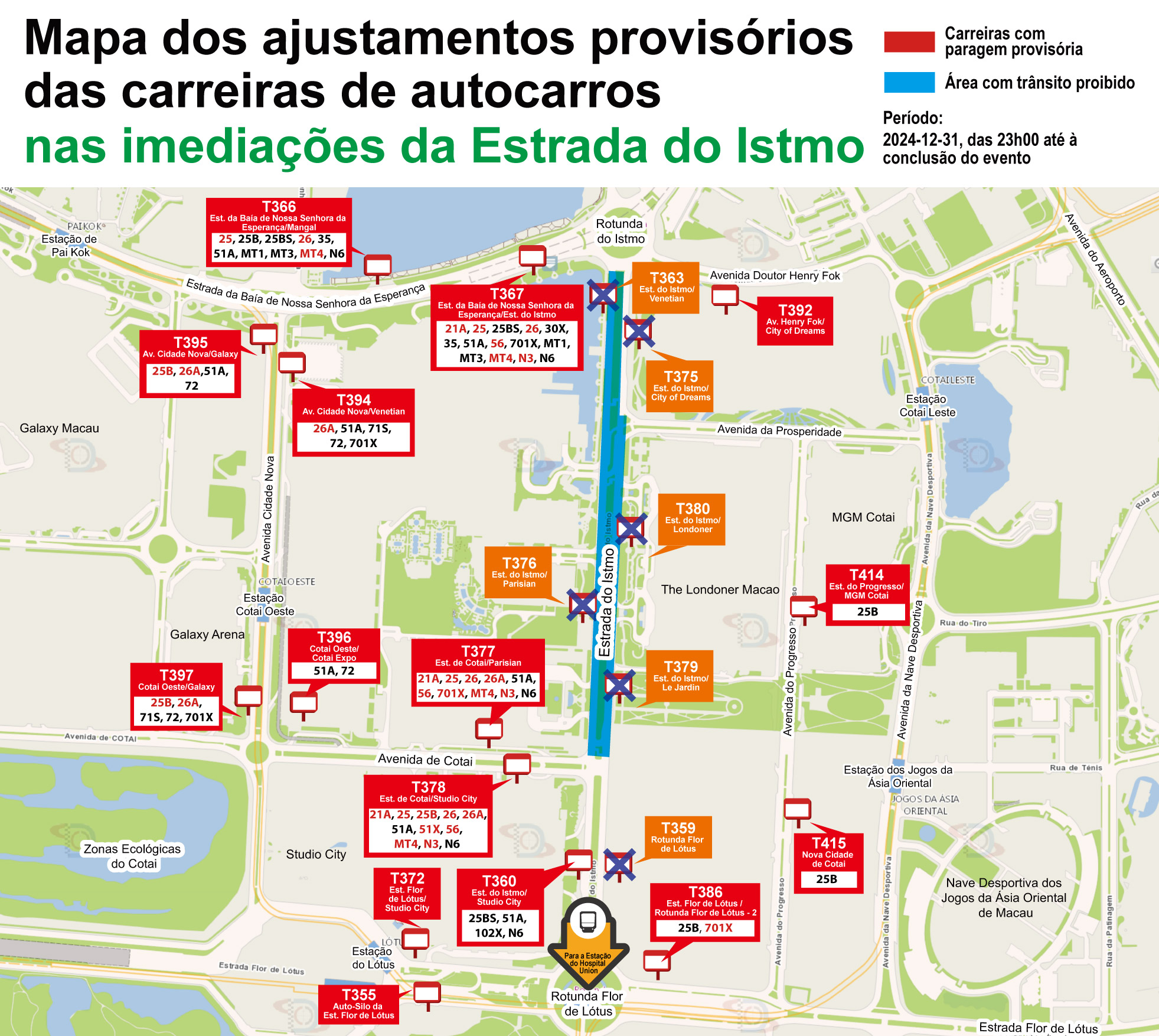 No que diz respeito à Estrada do Istmo, das 23h00 do dia 31 de Dezembro à 01h00 do dia seguinte, as paragens “Est. do Istmo / C.O.D.”, “Est.do Istmo / Londoner”, “Est.do Istmo / Le Jardin”, “Rotunda Flor de Lótus”, “Est. do Istmo / Parisian” e “Est. do Istmo / Venetian” serão temporariamente desactivadas. Os percursos das carreiras n.os 21A, 25, 25B, 26, 26A, 51A, 56 e MT4 serão alterados a partir das 23h00 até ao último autocarro, ajustando também as paragens de escala; 701X, N3 e N6 serão também alterados os seus percursos, ajustando provisoriamente as suas paragens até ao fim das actividades; a carreira especial do n.º 25B (25BS) entrará em funcionamento das 22h00 de 31 de Dezembro de 2024 às 03h00 do dia seguinte, e a carreira n.º 51X (em direcção às Portas do Cerco - sentido único) irá aumentar a frequência de partidas entre as 22h00 horas do dia 31 de Dezembro de 2024 e a 01h00 do dia seguinte, em articulação com as medidas provisórias de trânsito, será também alterado o seu percurso e ajustada temporariamente as paragens de escala. Para mais informações, vide as páginas electrónicas da TCM (http://www.tcm.com.mo) e da Transmac (http://www.transmac.com.mo).